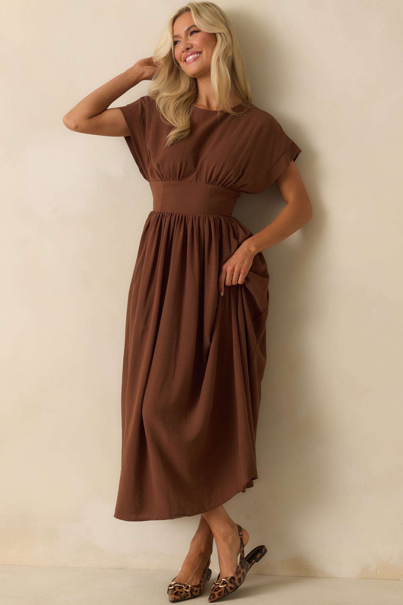 As Promised Brown Short Sleeve Cinched Waist Maxi Dress