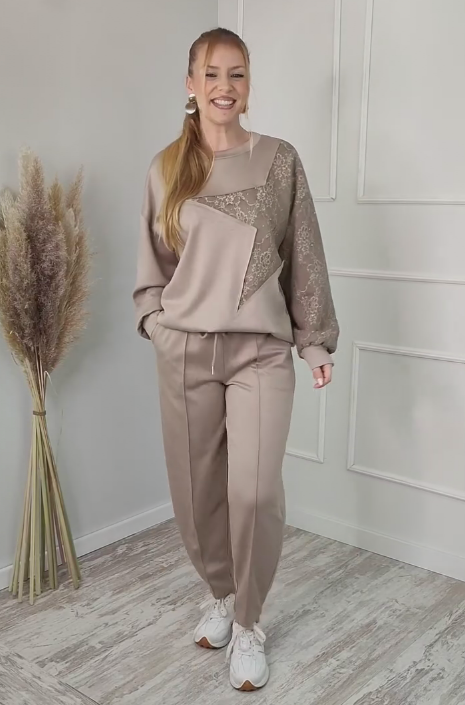 Bluza z okrągłym dekoltem ozdobiona gwiazdkami i cekinami oraz dres z szerokimi spodniami w tej samej kolorystyce.