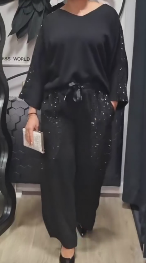 Dwuczęściowy komplet z cekinami: bluzka z dekoltem w serek + szerokie spodnie ze ściągaczem