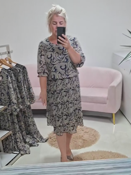 Sukienka z okrągłym dekoltem i rękawami do połowy łydki, ozdobiona geometrycznym wzorem.