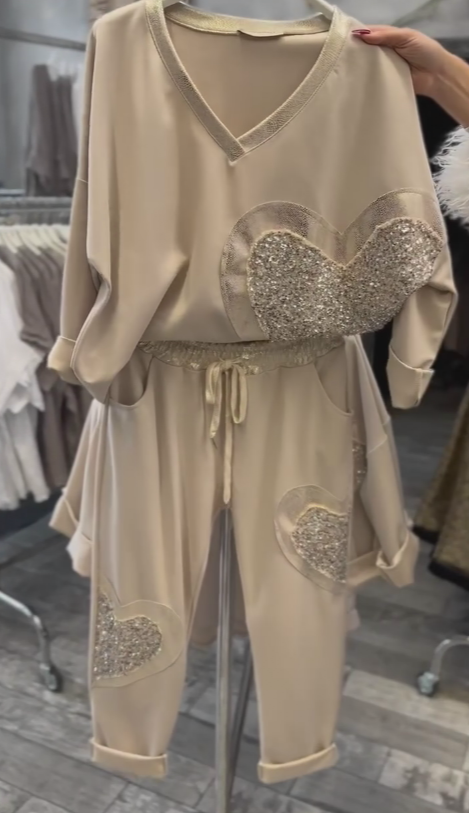 Komplet z cekinami w kształcie serca i dekoltem w serek