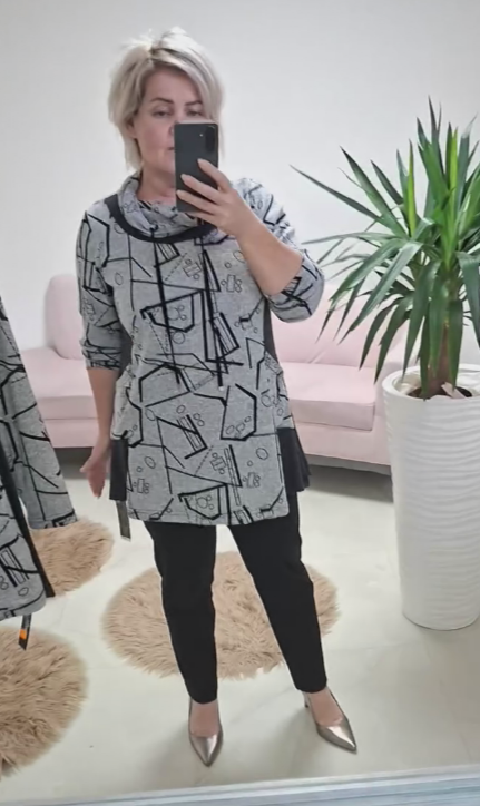 Komplet bluzka i spodnie z dekoltem w serek i rękawami trzy czwarte