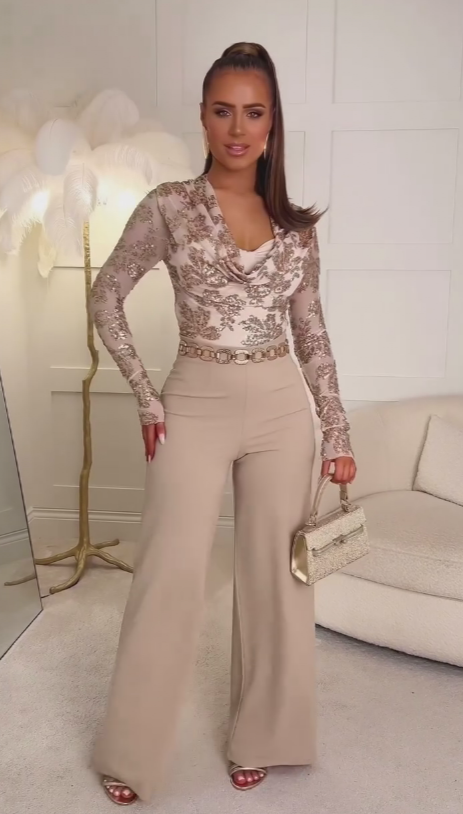 Błyszczący top z przezroczystym dekoltem ozdobiony kryształkami w połączeniu ze spodniami o dopasowanym kroju tworzą luksusowy zestaw.