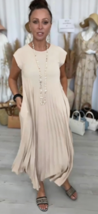 ✨Oferta ograniczona czasowo✨ Luźna, plisowana sukienka maxi bez rękawów i z okrągłym dekoltem.