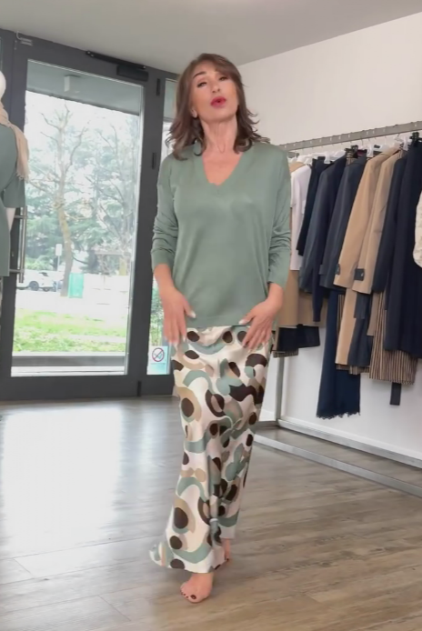 Elegancki i stylowy garnitur w geometryczne wzory: bluzka z długim rękawem i dekoltem w serek + wzorzysta sukienka typu slip