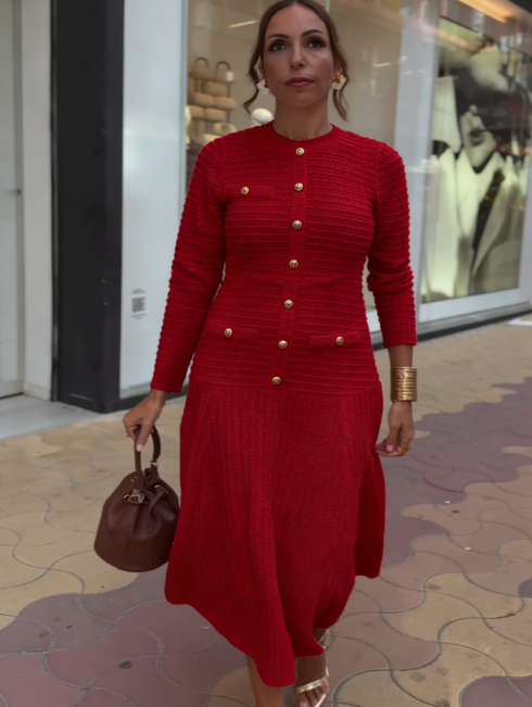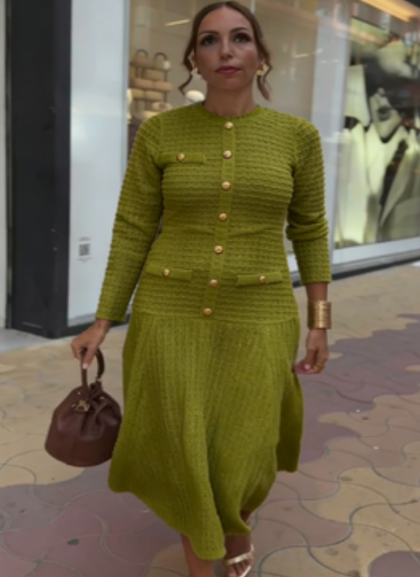 Sukienkę zdobią starannie ułożone, eleganckie złote metalowe guziki, które wizualnie dzielą cały strój.