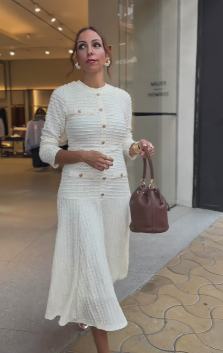 Ta sukienka ma miękką, białą bazę, emanującą wyrafinowaniem i elegancją. Materiał został wykonany techniką delikatnego