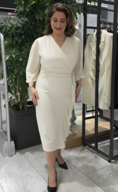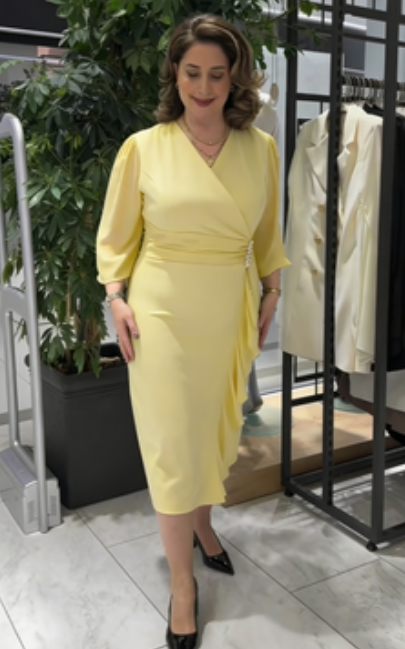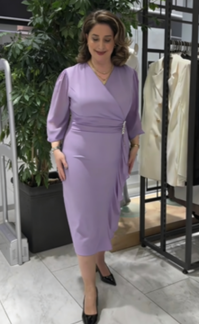 Ta sukienka łączy w sobie elegancję i profesjonalizm. Dekolt w kształcie litery V w stylu krzyżowym pięknie modeluje linię