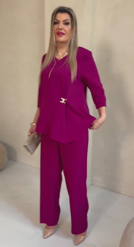 Góra ma dekolt w serek, rękawy 3/4 i metalowe klamry z boku w pasie; dół zestawiono ze spodniami z