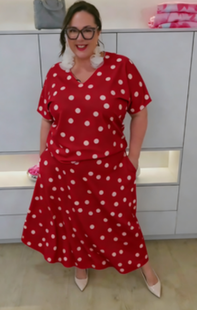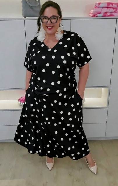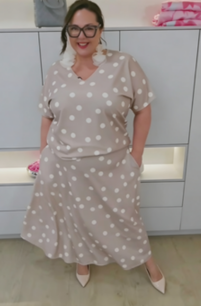 dekoltem w serek, efektownymi, rozszerzanymi rękawami i wzorem w groszki lub róże,