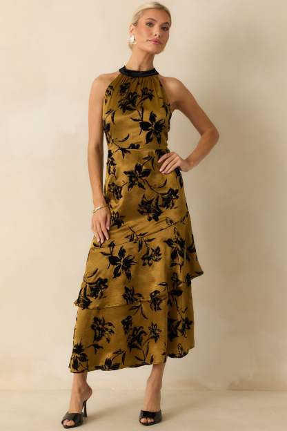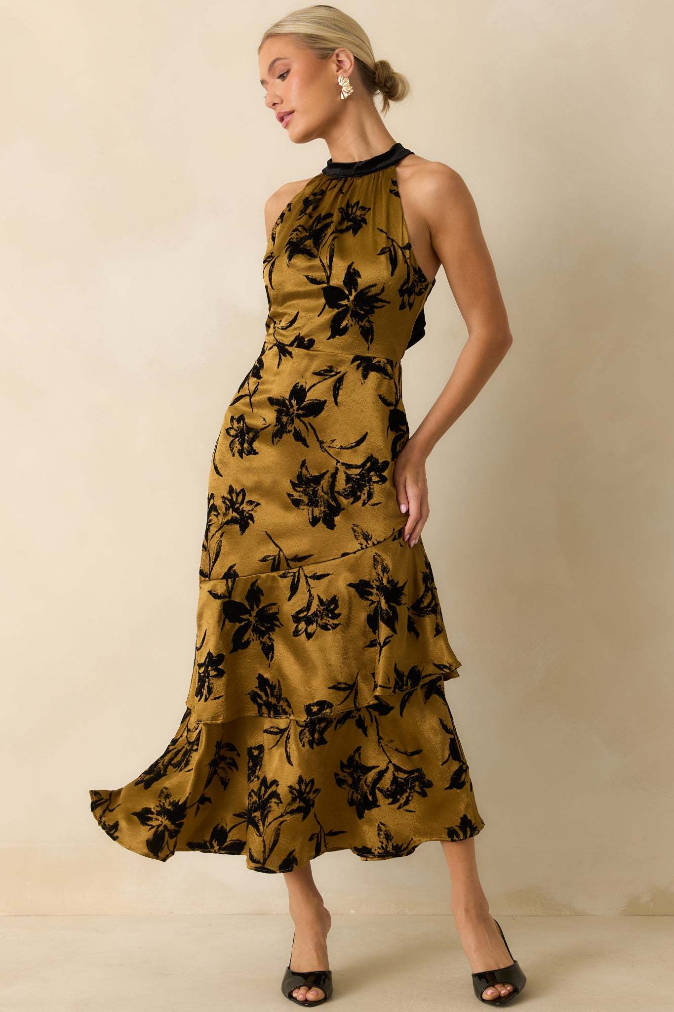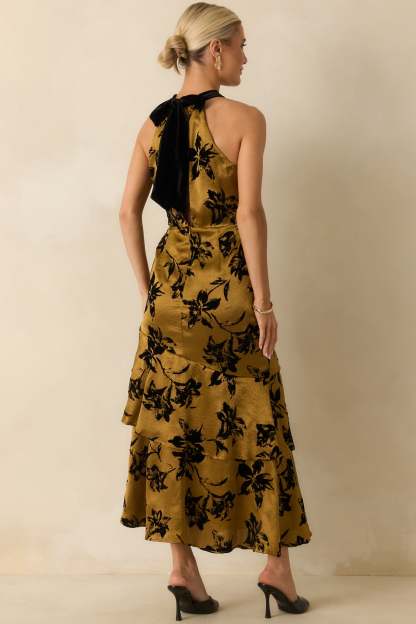 There’s something unforgettable about the Sweet Recollection Dark Gold Floral Satin Maxi Dress — its luxe satin catches every glimmer of light, while soft velvet florals and a flowing tiered skirt create an air of timeless allure. With its graceful halter neckline and statement bow tie back, this piece was made for evenings that linger in memory. This dark gold floral satin maxi dress features a halter neckline with a black velvet bow tie back, a fitted bodice with a tiered skirt, and a concealed back zipper, fully lined in smooth woven fabric for an elegant, refined finish.