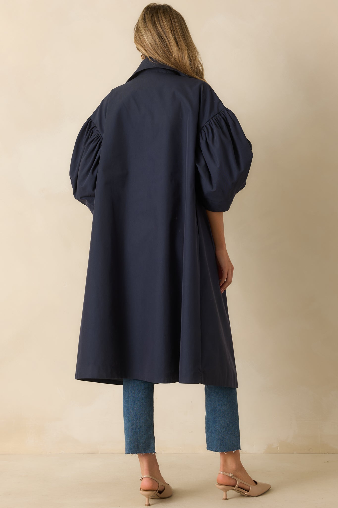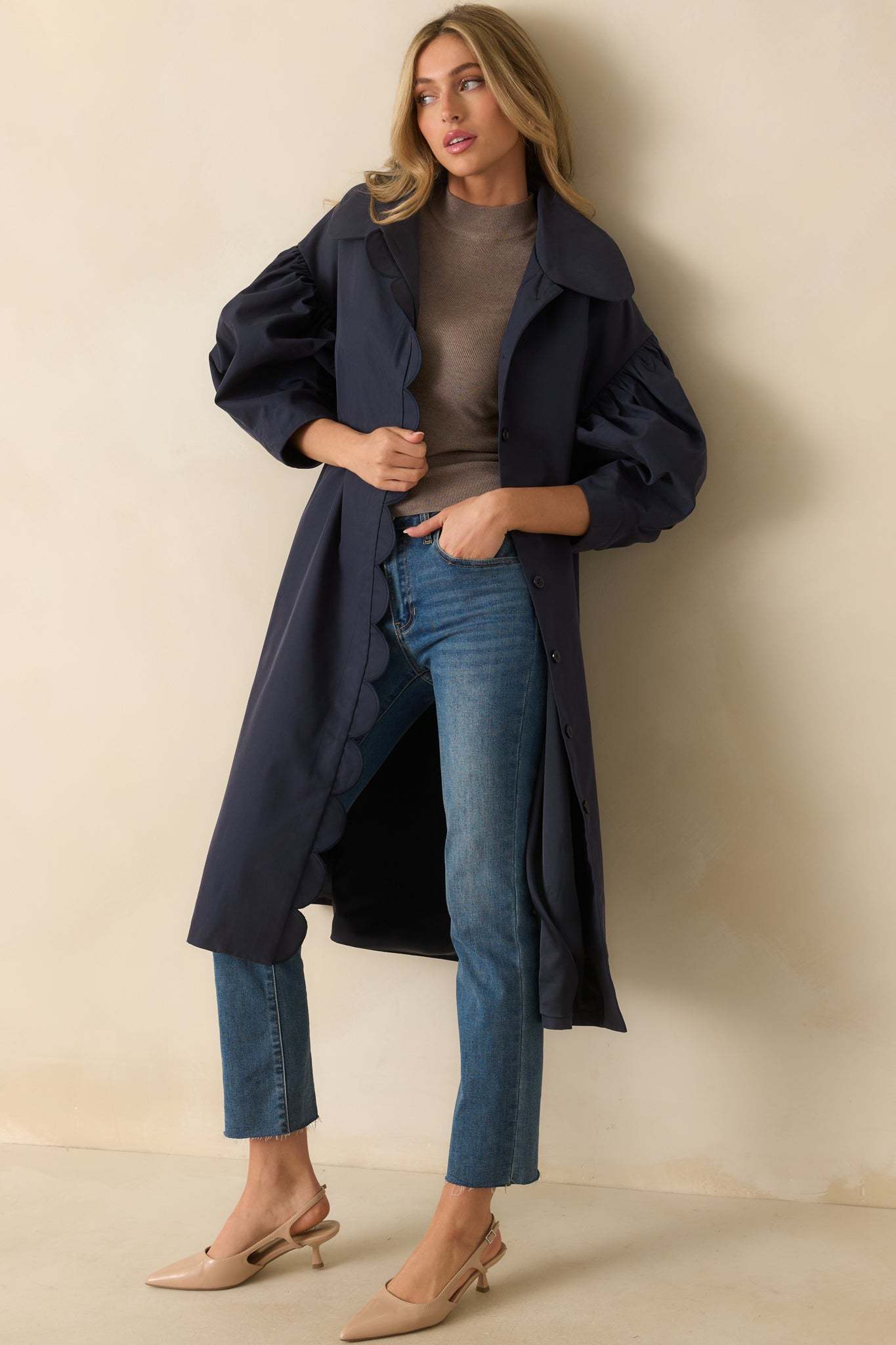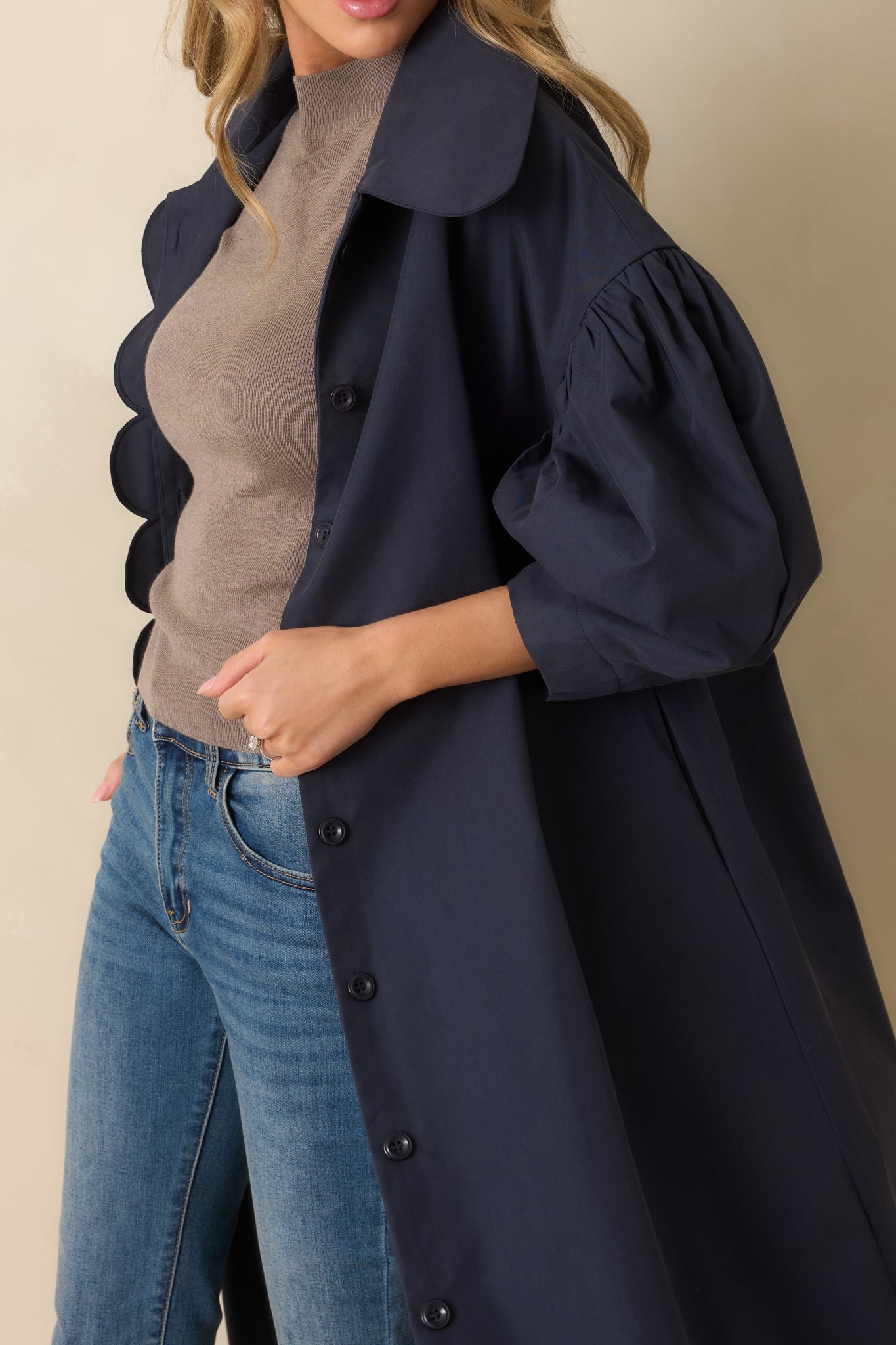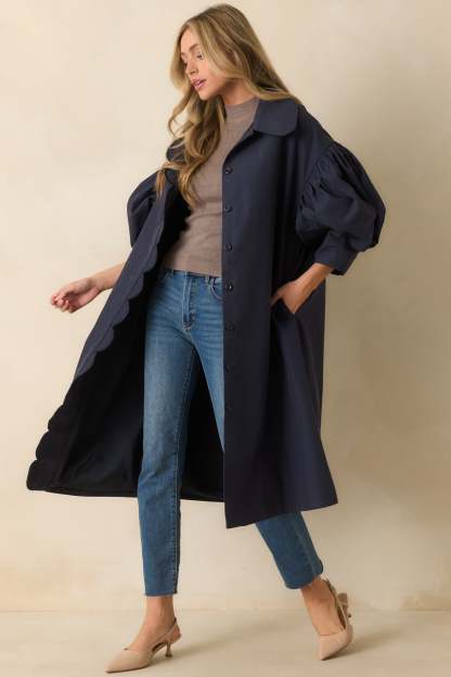 The All In Good Fun Navy Scallop Trim Puff Sleeve Button Front Coat brings a playful twist to polished outerwear, a charming layer that makes stepping out feel a little more special. This navy coat features a collar neckline, dramatic puff sleeves with gathered shoulders, scalloped edge trim, functional button front, side seam pockets, and a relaxed silhouette.