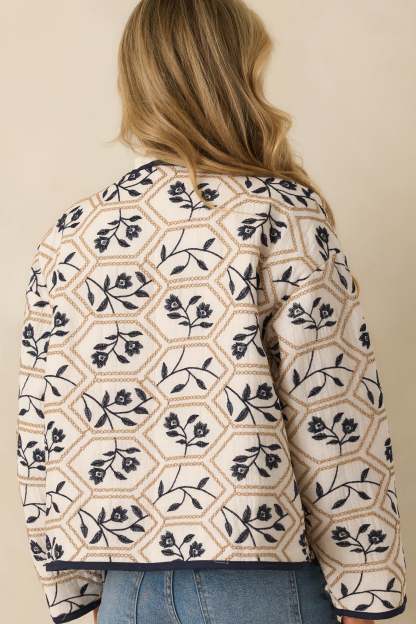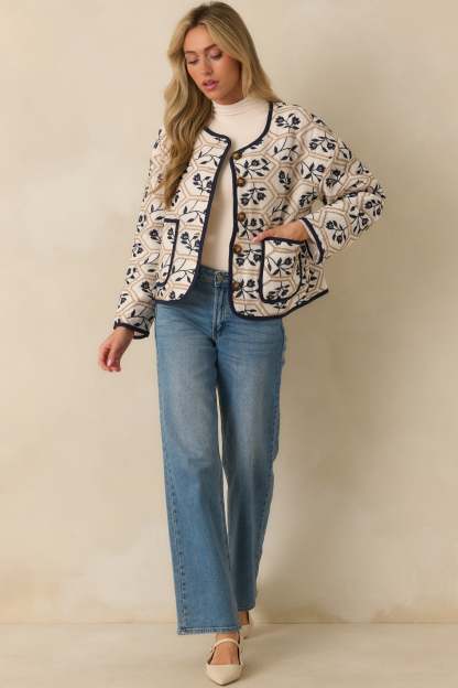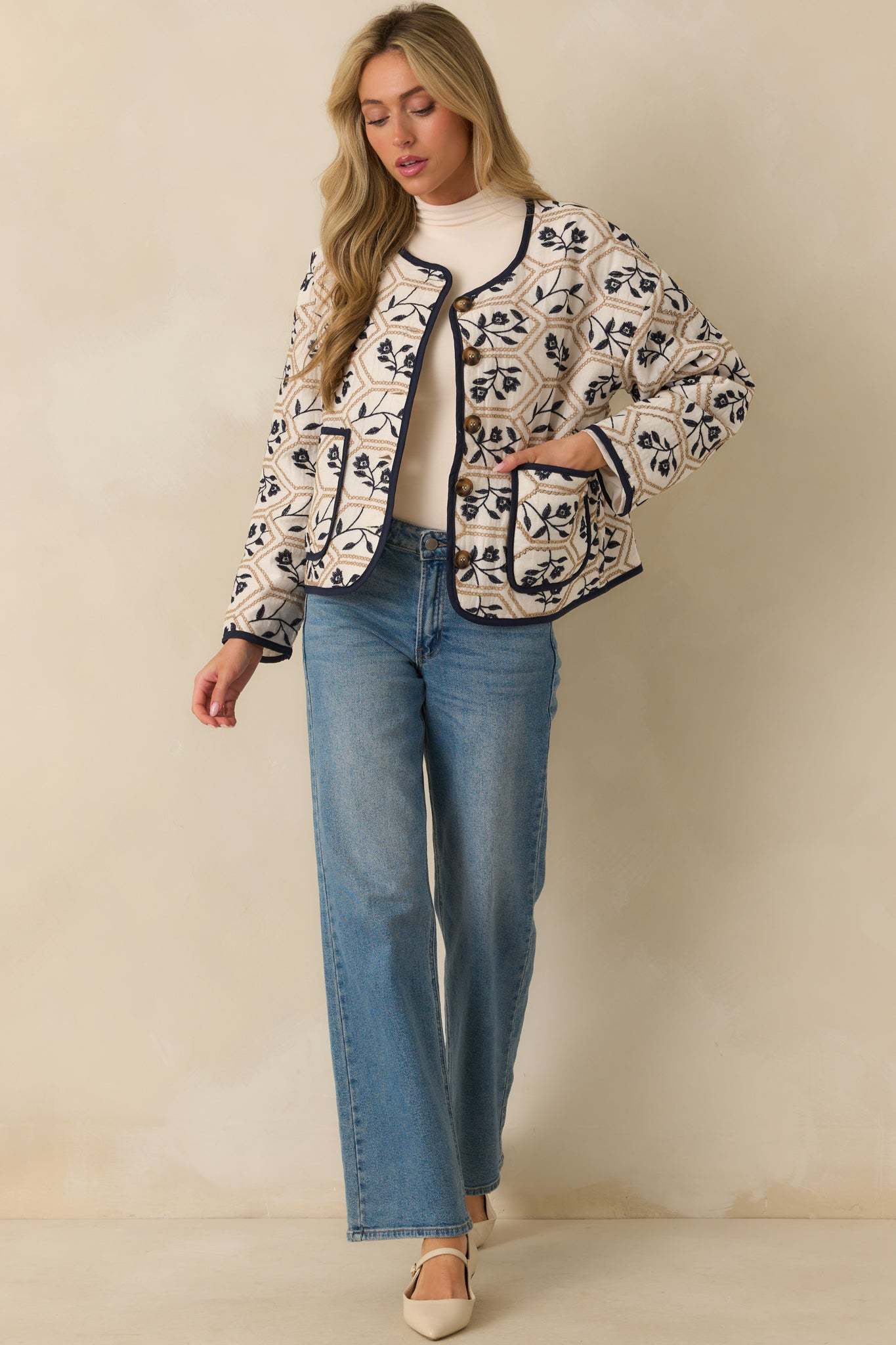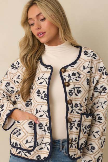 The All The Right Ways Ivory Floral Embroidered Quilted Jacket has a cozy charm, bringing just the right mix of style and comfort to make every outfit feel put-together in your own way. This ivory jacket features a tan and navy floral embroidered geometric pattern, a round neckline, long sleeves, functional button front closure with tortoise shell buttons, contrast navy trim, functional front patch pockets, and a relaxed fit.