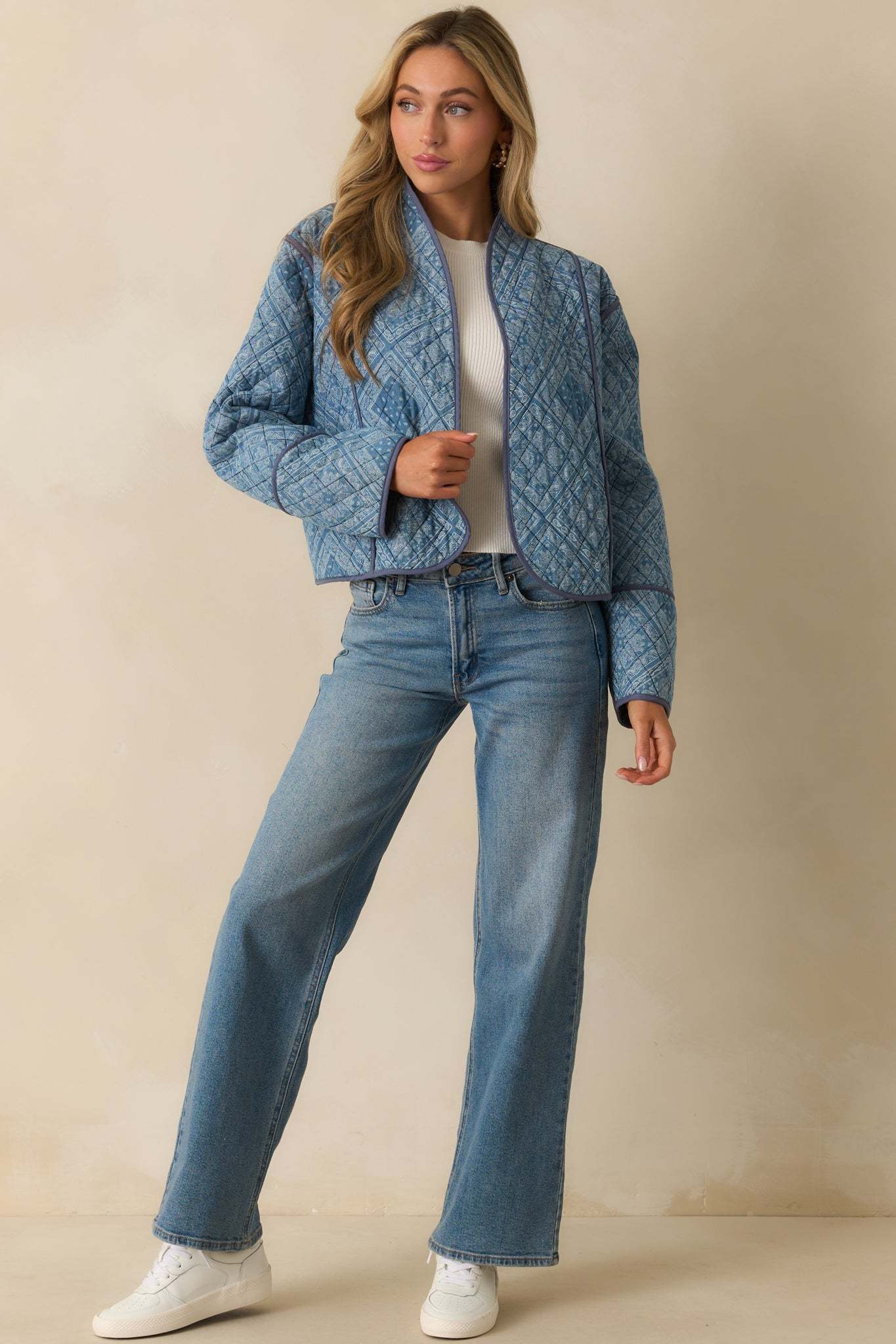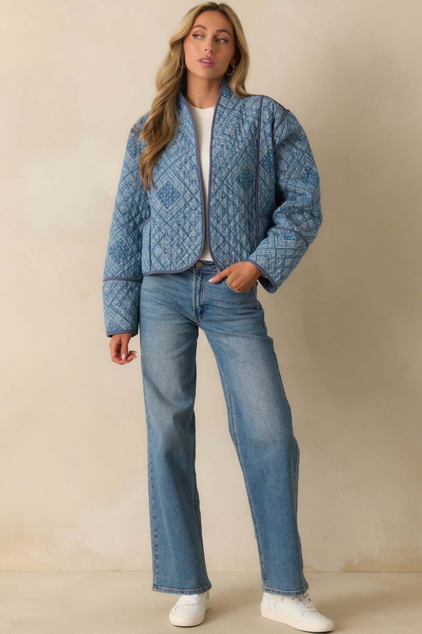 Stay warm and stylish with our All You Do Light Blue Quilted Jacket. This lightweight jacket features a quilted design, perfect for layering in cooler weather. With a relaxed fit and soft material, it's comfortable to wear and adds a pop of color to any outfit. Stay fashionable and cozy with our jacket. This light blue jacket features shawl lapels, a quilted design, a navy interior, navy trim detailing throughout, a geometric paisley print, functional pockets, and long sleeves.