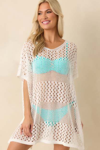 Get ready to slay the beach in our Call It Paradise White Cover Up! This versatile piece features a flowy fit and soft, breathable fabric for maximum comfort. It's the perfect way to effortlessly elevate your swimsuit game. Paradise awaits, so grab yours now! This cover up features a v-neckline, a transparent knitted fabric, and a split hemline.