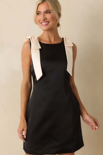 The Call It What You Want Black Satin Sleeveless Mini Dress speaks for itself, an easy statement piece that looks good no matter what you call it. This black mini dress features a shiny satin fabric, round neckline, sleeveless design, concealed side zipper closure, fitted silhouette, ivory satin bow accents at the shoulders, and functional pockets.