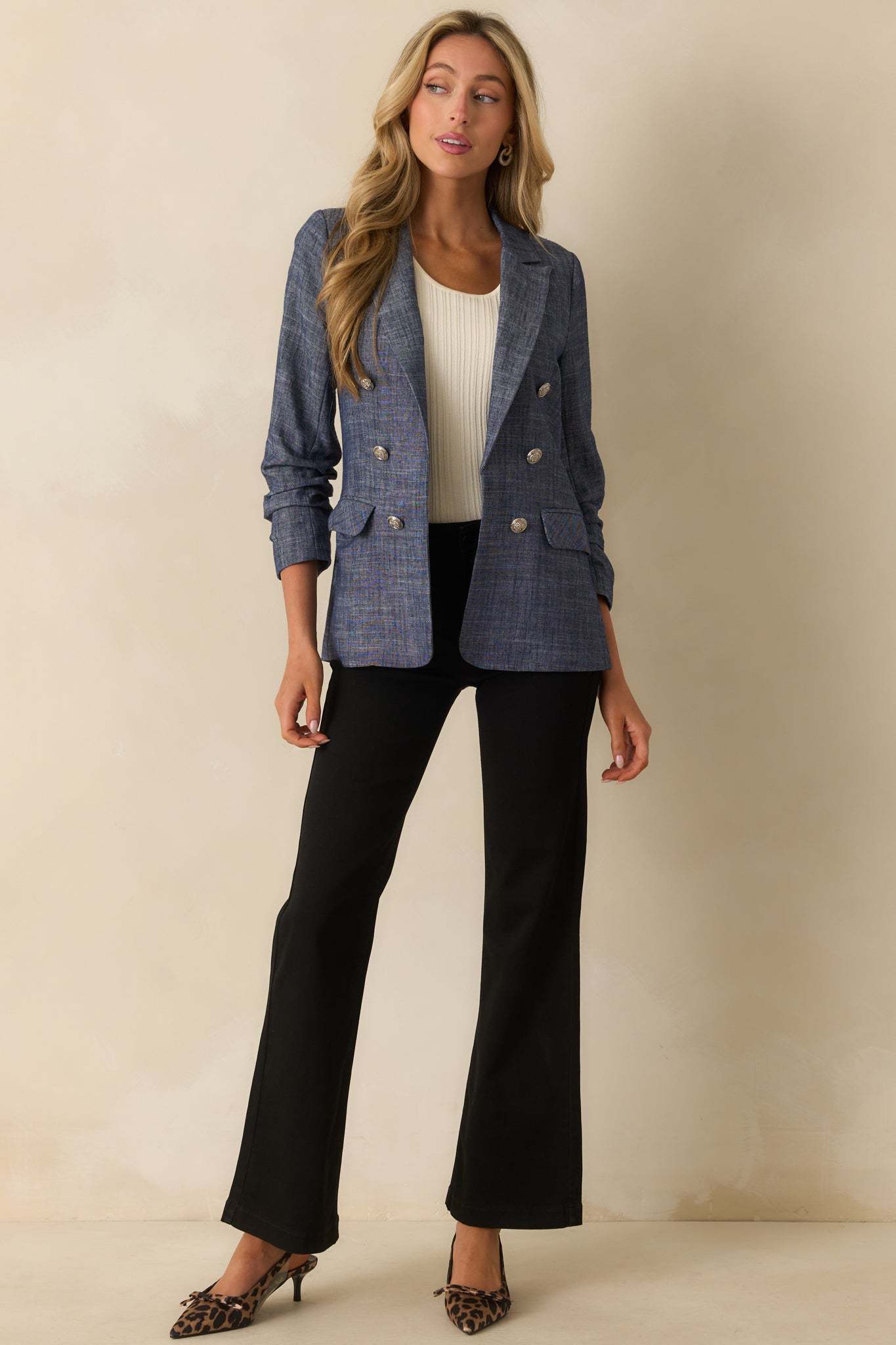 The Confident Energy Dark Wash Chambray Ruched Sleeve Blazer combines structured style with a laid-back charm, effortlessly elevating any outfit with its versatile design. This blazer features a notched lapel collar, ruched 3/4 length sleeves, decorative front buttons, lightweight fabric, navy lining, and functional hip pockets.