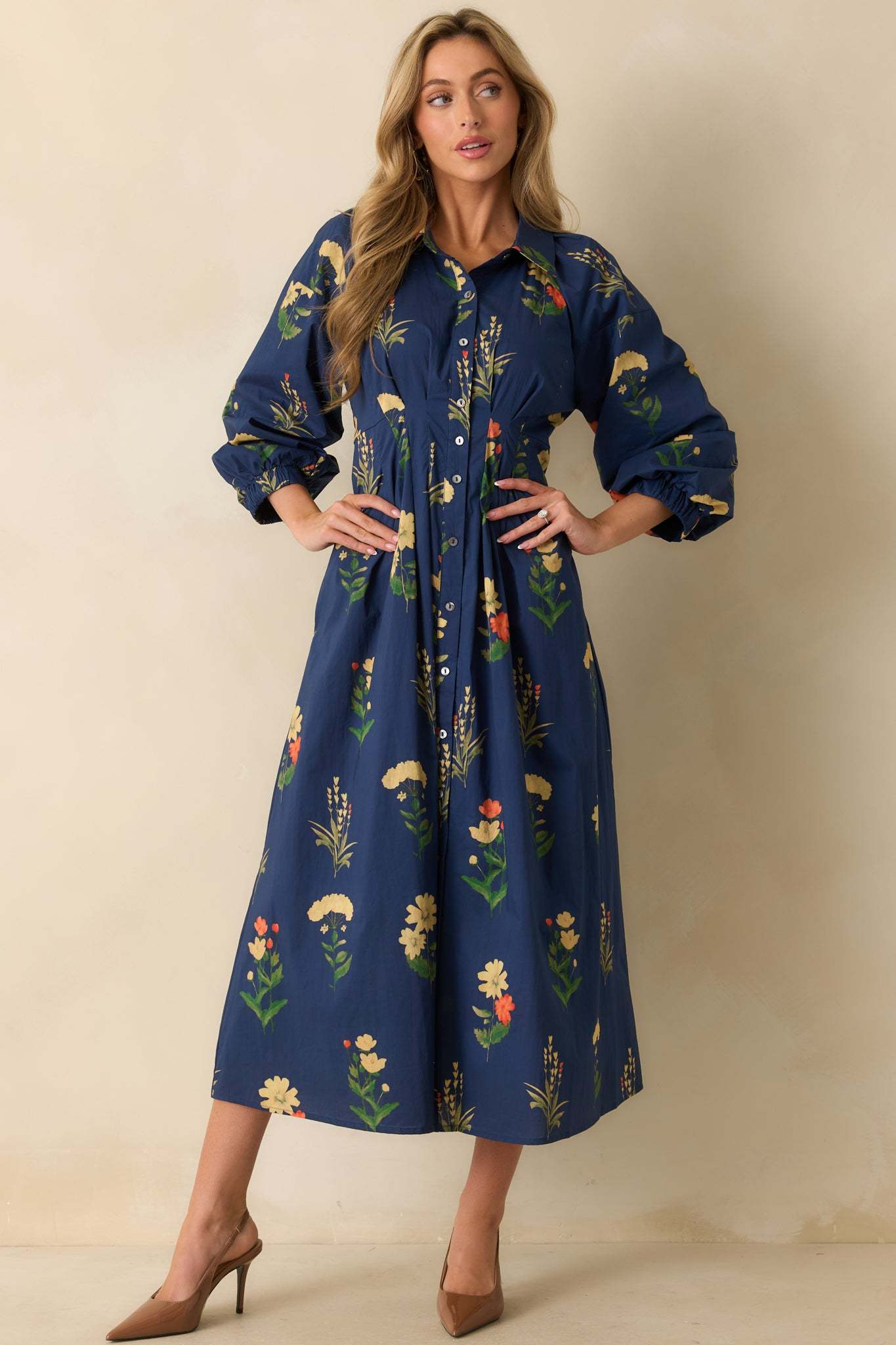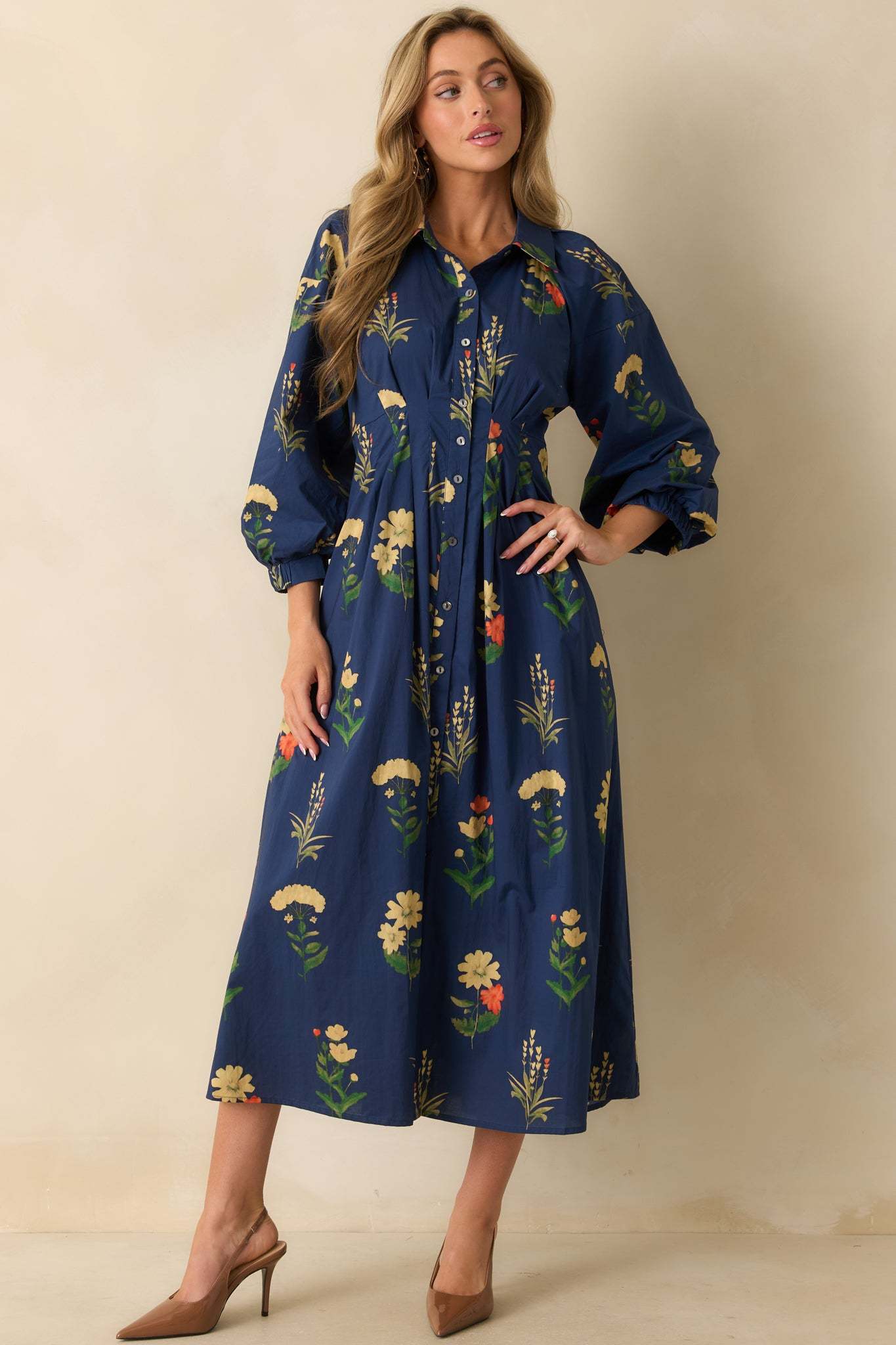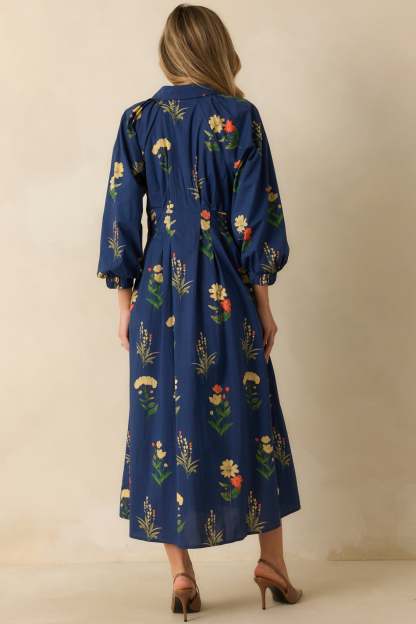 The Endlessly Charmed Navy Multi Floral Print Cotton Button Front Maxi Dress brings an air of timeless charm to your day. With its flowing silhouette, romantic floral print, and softly structured shape, this piece feels as effortless as it is refined - perfect for moments that call for something beautifully put together. This navy blue woven dress features a collared neckline, button-front closure, long bishop sleeves with buttoned cuffs, a pleated waist for shape, side pockets, and an allover floral print.
