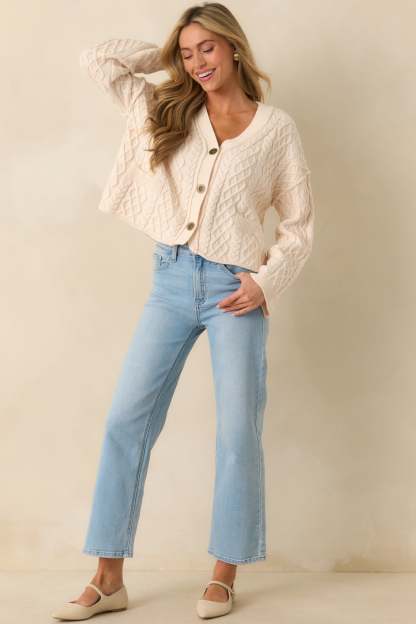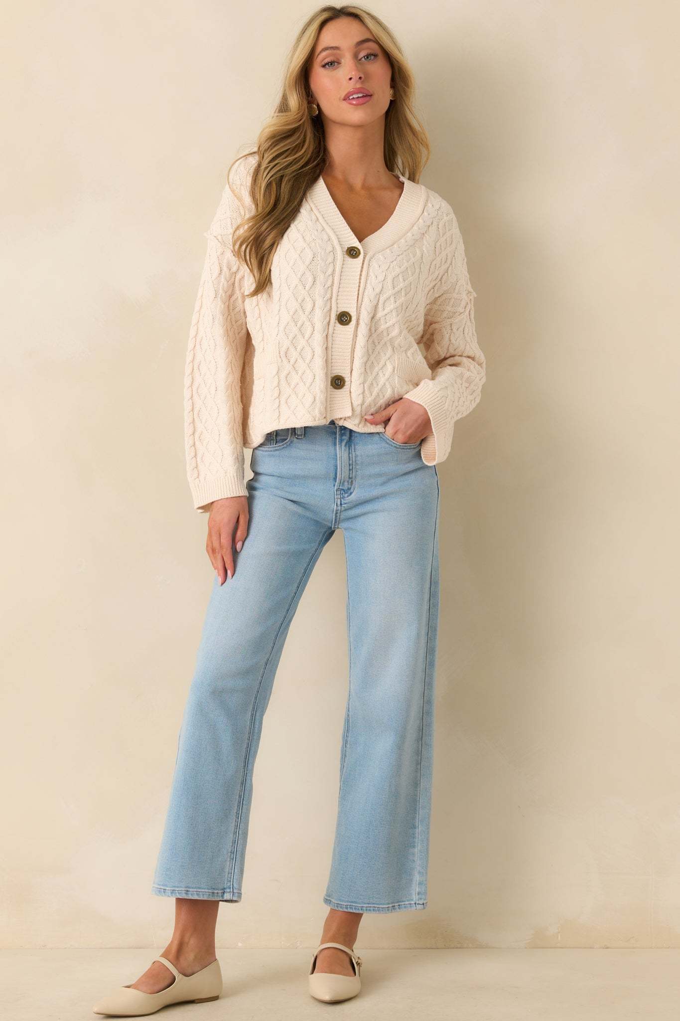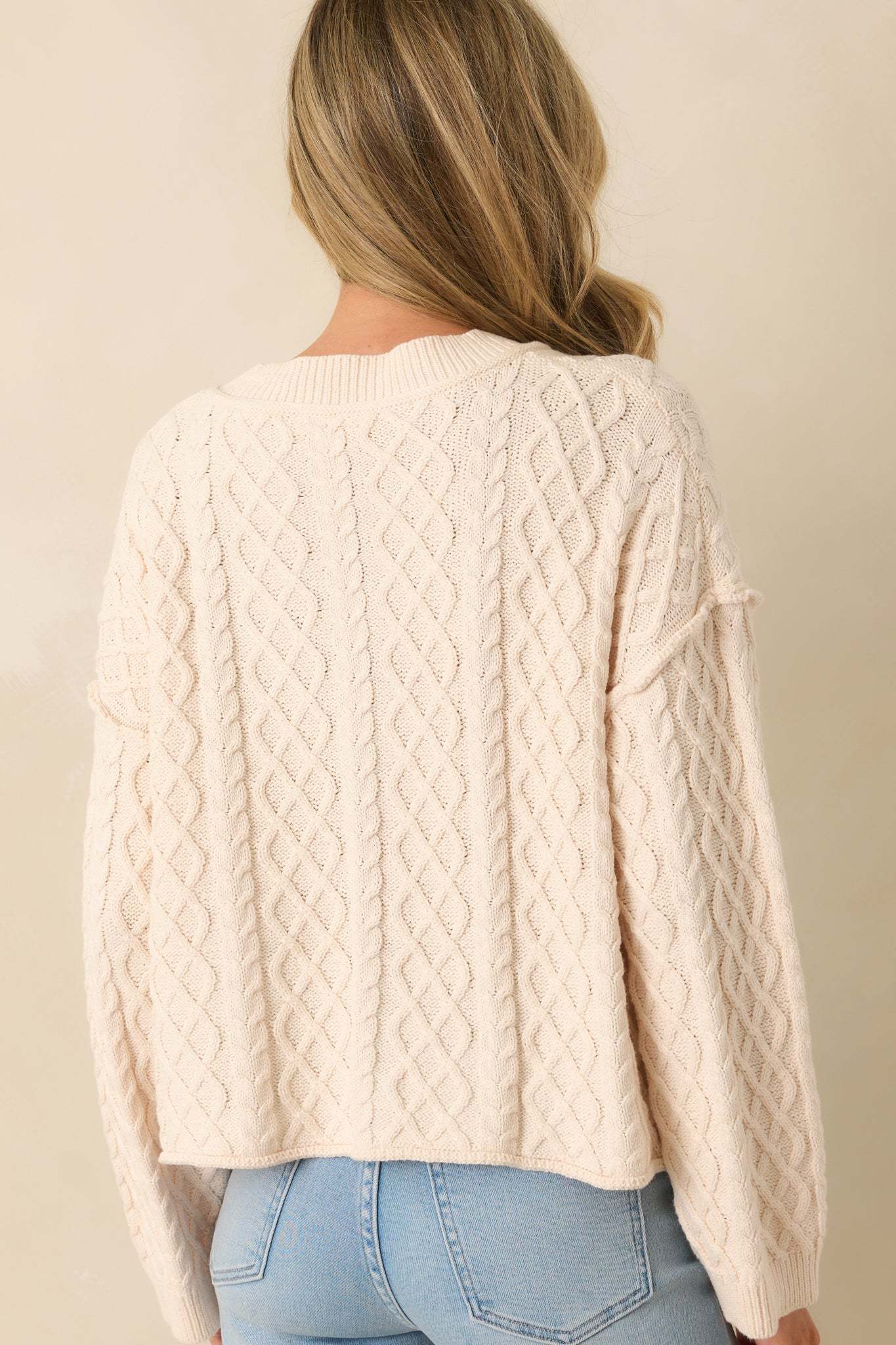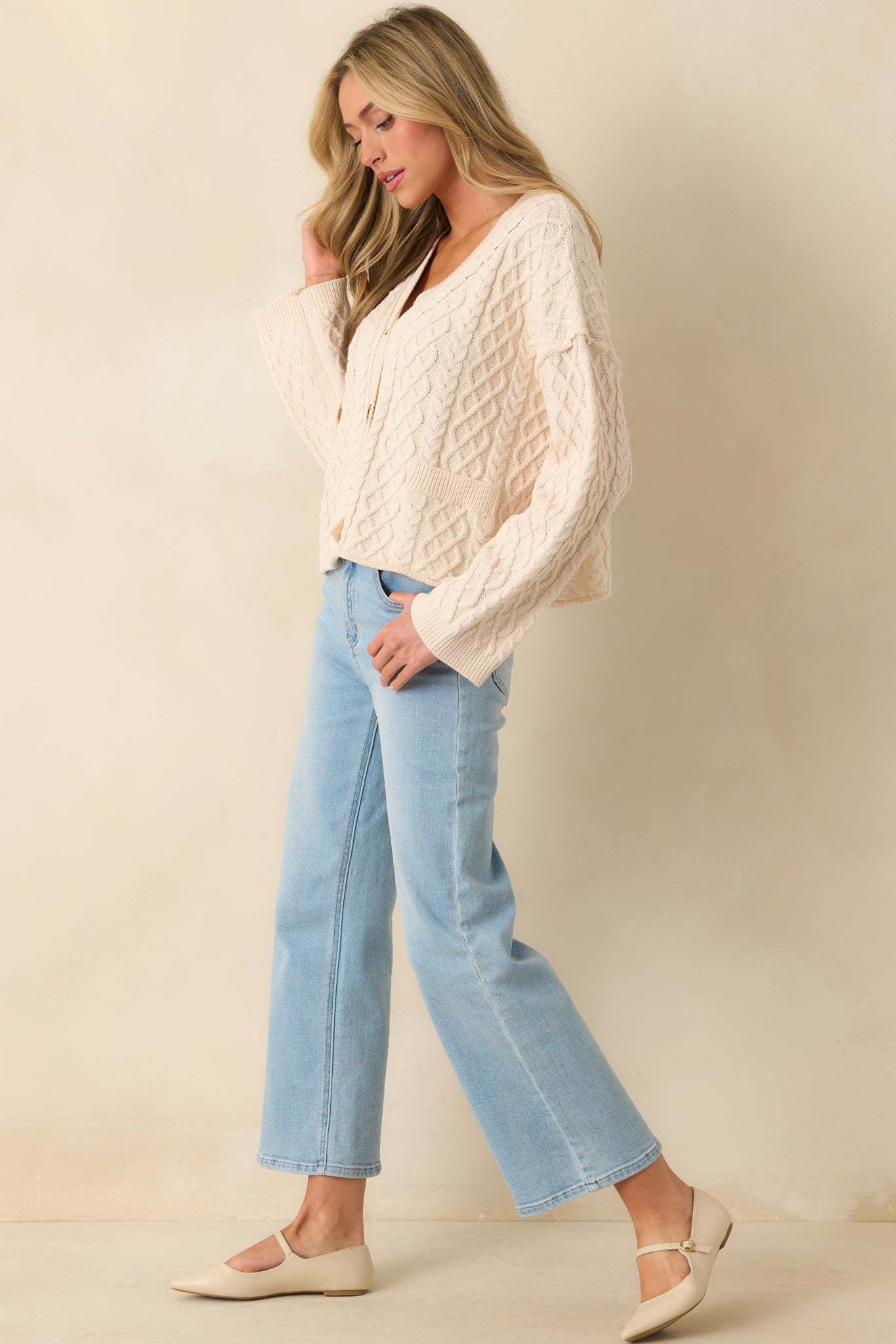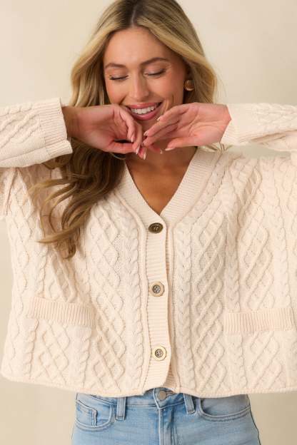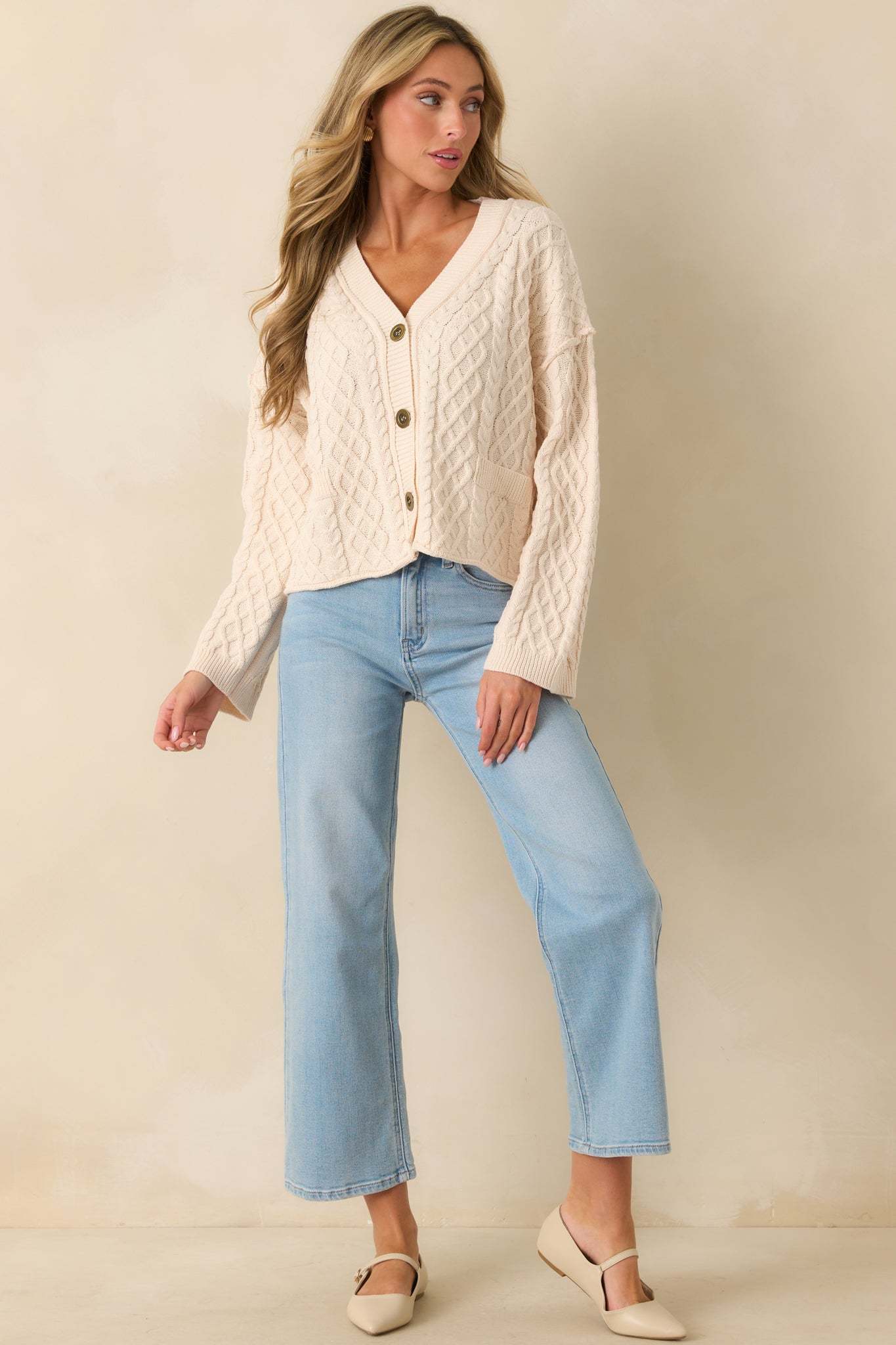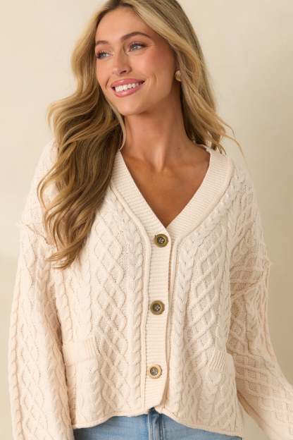 The For Old Time’s Sake Ivory Cable Knit Button Up Cardigan brings back that timeless, cozy charm you can count on, making every outfit feel warm, classic, and effortlessly stylish. This ivory cardigan features a cable knit design, v-neckline, functional button front, faux front patch pockets, long sleeves, ribbed hems, and a relaxed fit.