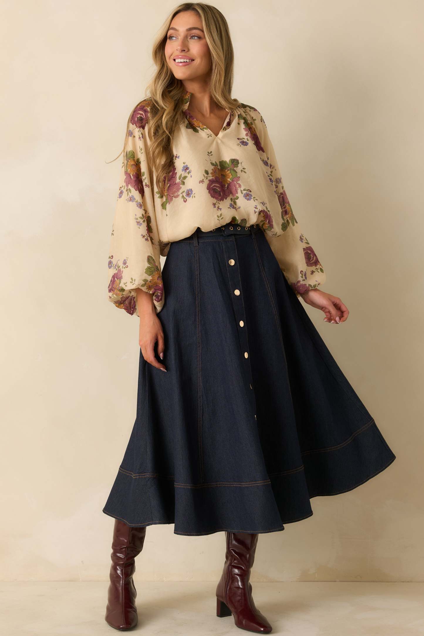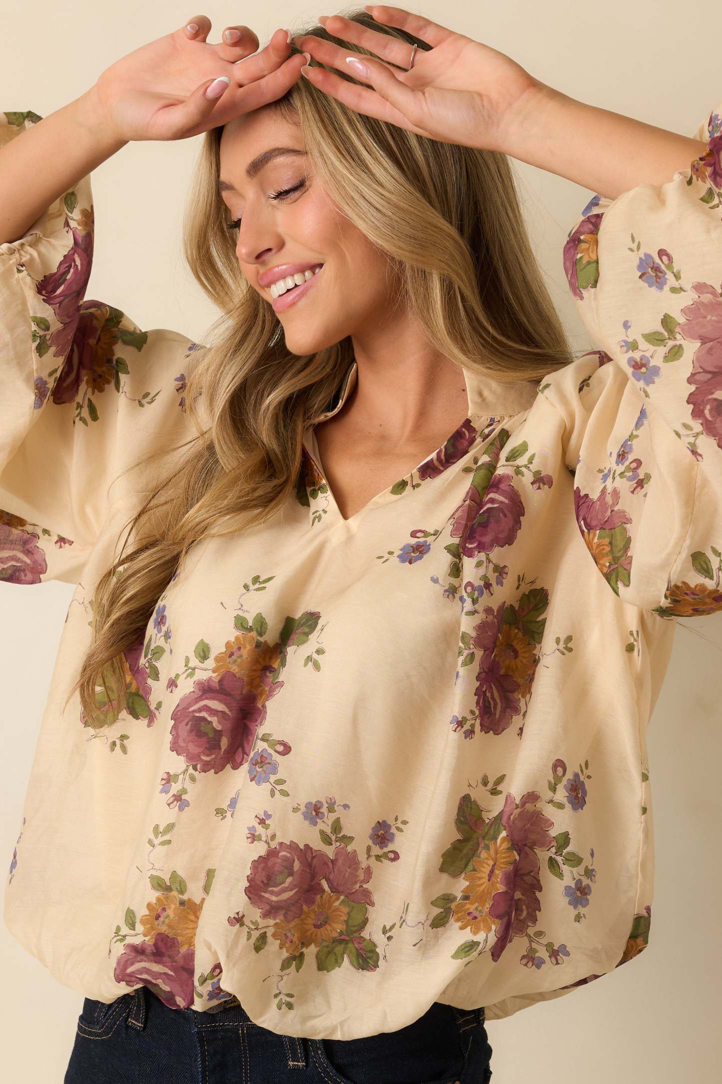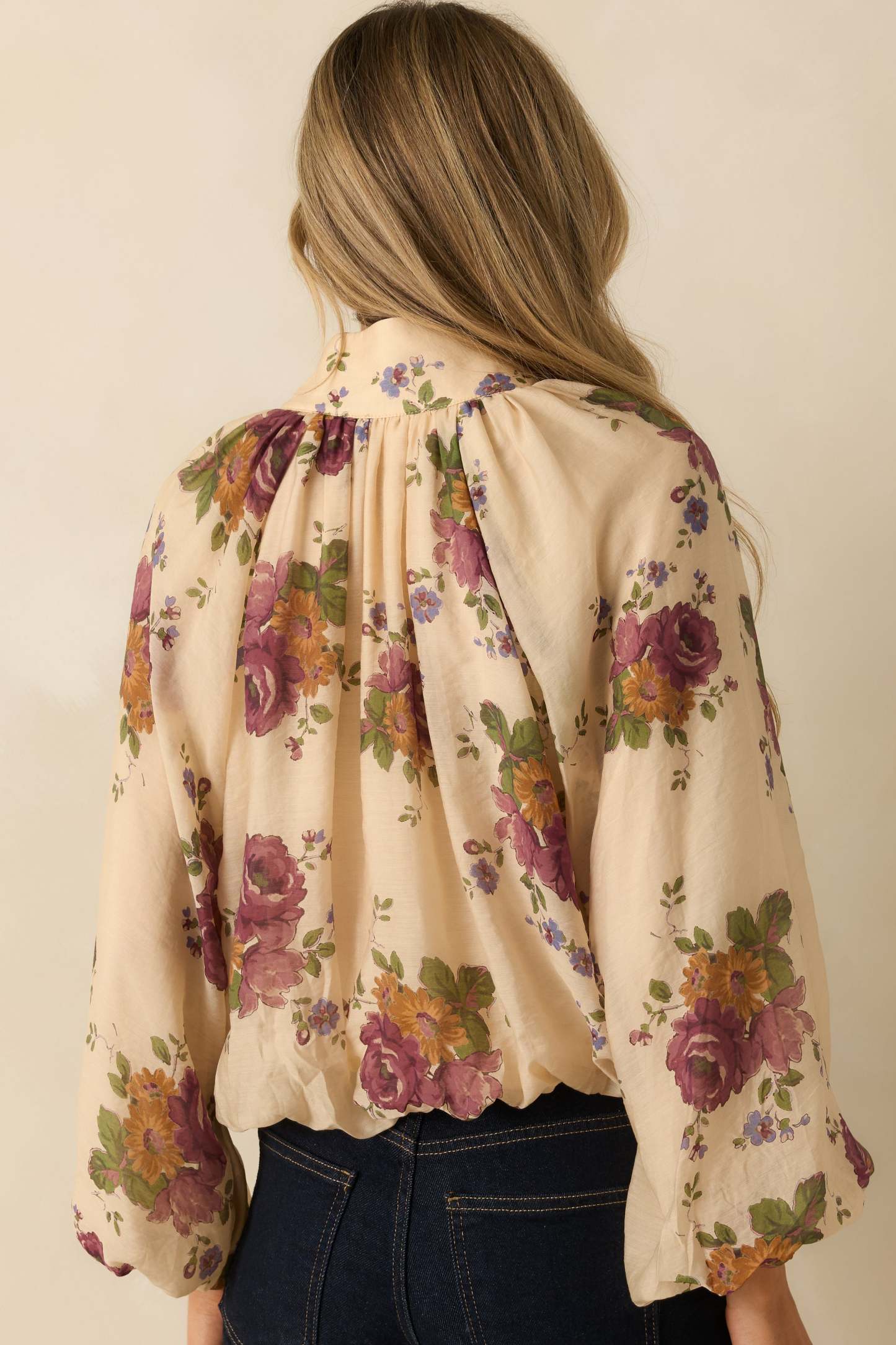 The Garden Daydream Ivory Multi Floral Peasant Sleeve Blouse brings a touch of soft romance to the everyday. Its billowing sleeves, vintage-inspired florals, and airy drape make every outfit feel that little bit more graceful. Whether styled with denim or tucked into something tailored, it's floral moment that never feels overdone. This ivory multi floral print blouse features a split neckline with a stand collar, gathered shoulders, long blouson sleeves with elastic cuffs, and a relaxed silhouette with an elastic hemline.