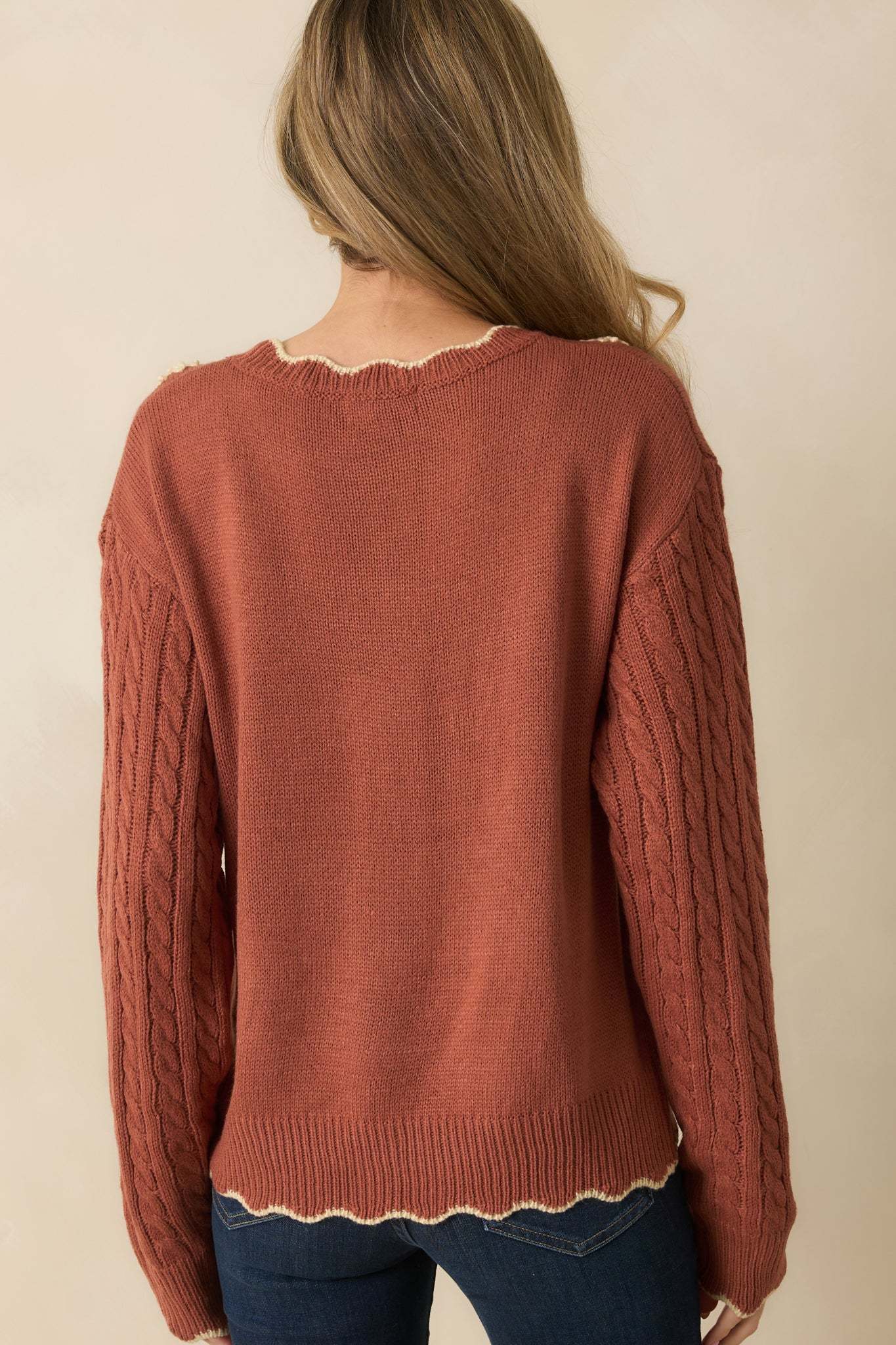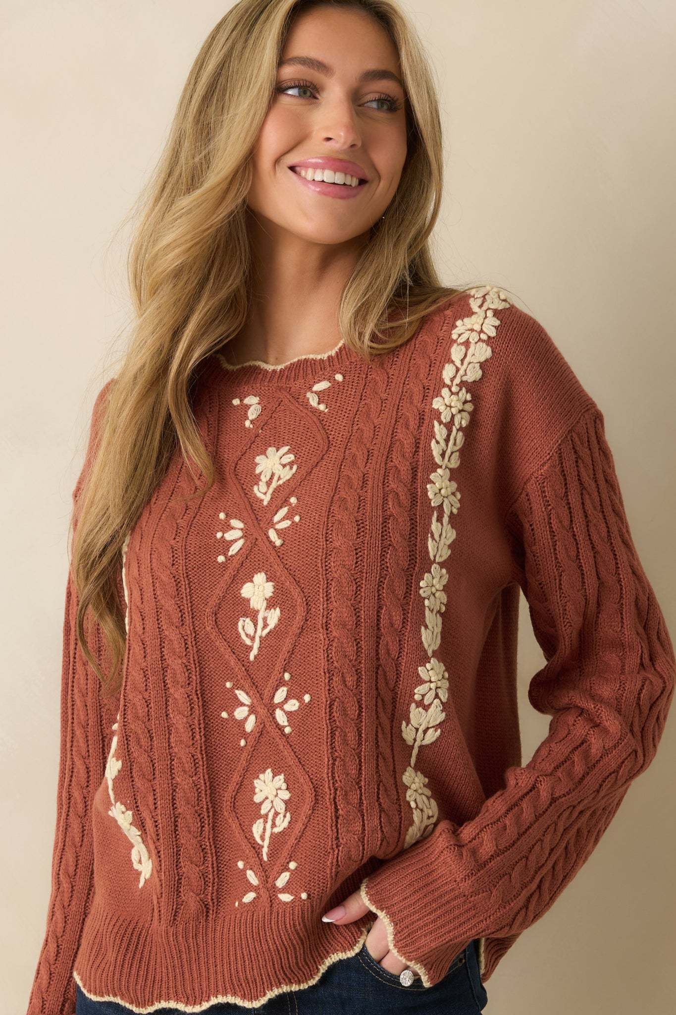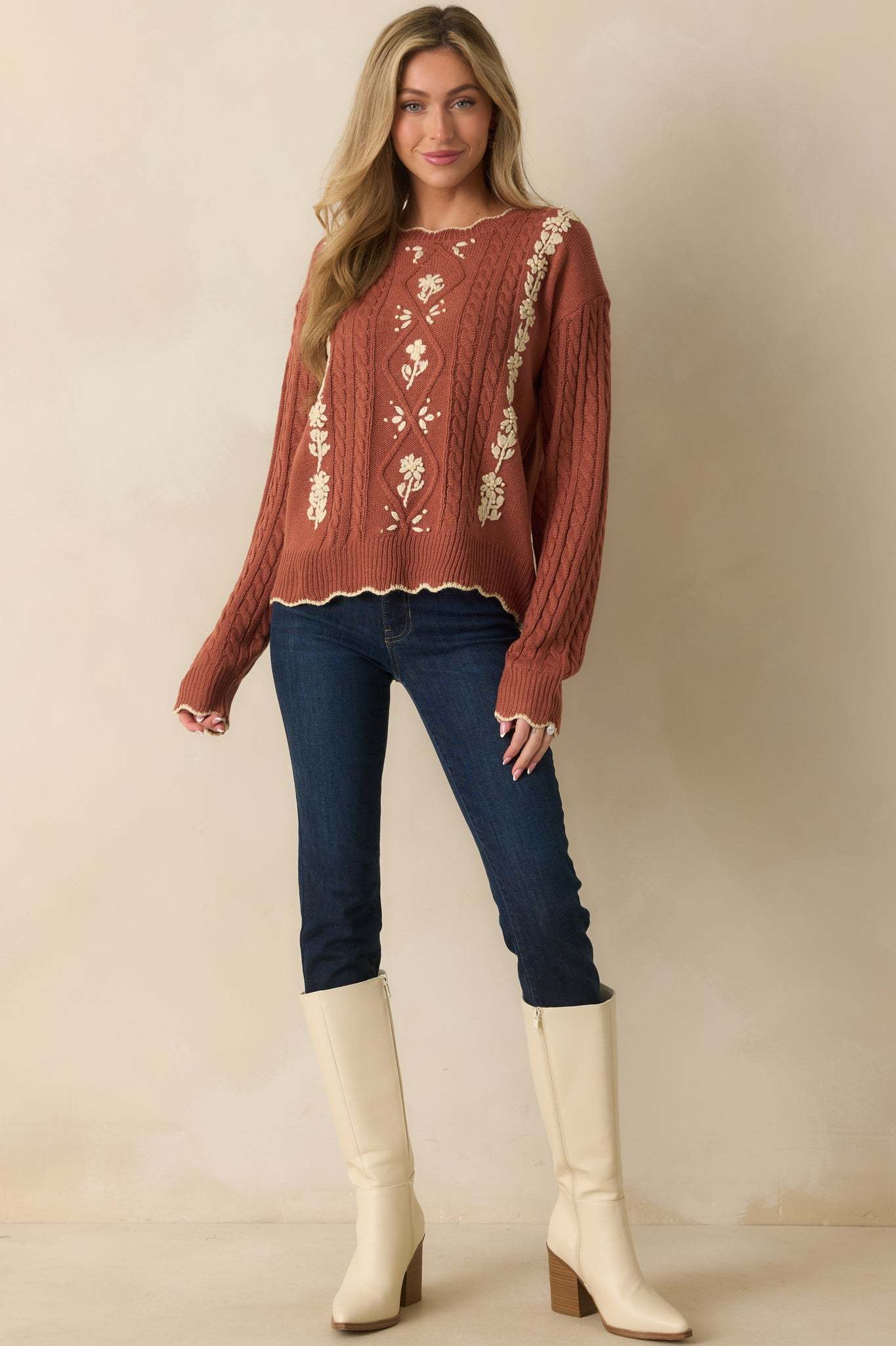 The Guess Again Terracotta Cable Knit Floral Embroidered Scallop Hem Sweater keeps cozy style unexpected, a feminine knit with subtle detail that feels fresh for the season. This terracotta cable knit sweater features an ivory floral embroidered front, a crew neckline, scalloped trim, long sleeves, and ribbed cuffs.
