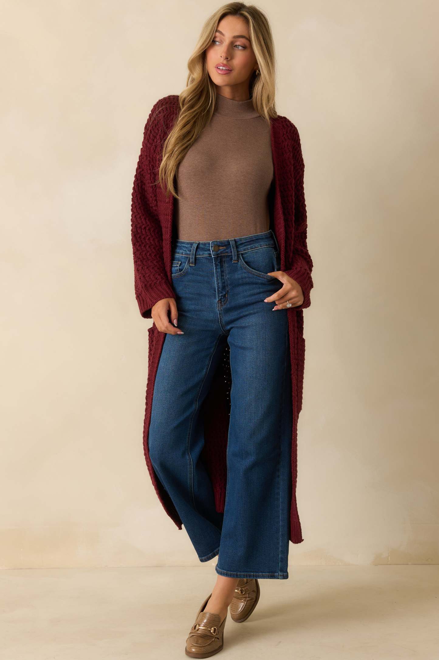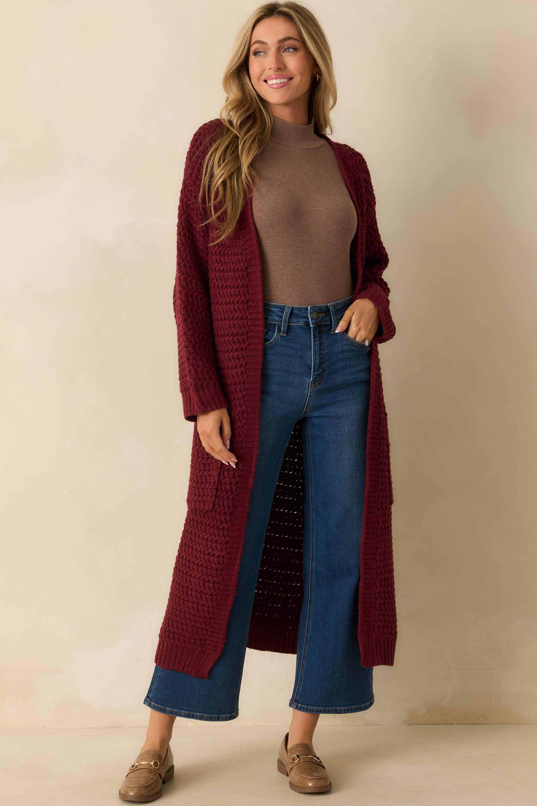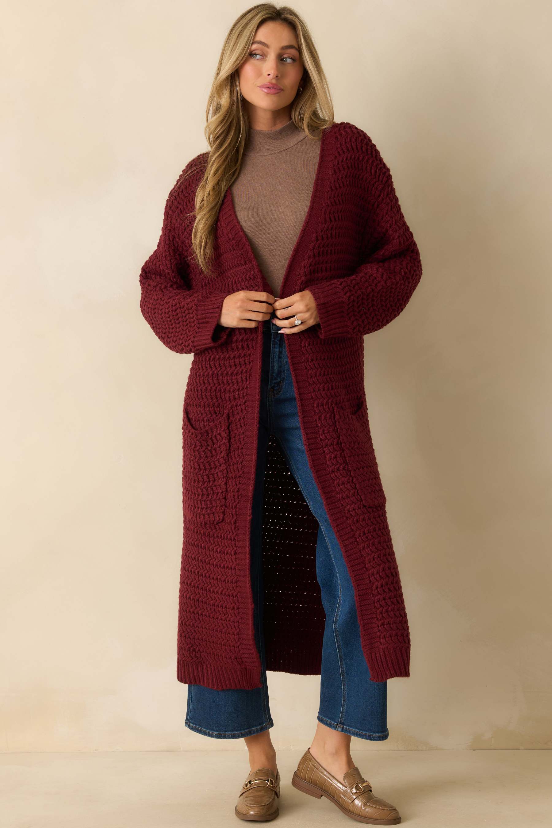 The Made For More Wine Red Knit Duster Cardigan proves that cozy can still make a statement. With its chunky textured knit, open front, and extra-long silhouette, it’s the layer that adds quiet confidence, and warmth, to every look. This red knit duster cardigan features an open front, long sleeves with ribbed cuffs, front patch pockets, and a relaxed longline silhouette in a chunky textured knit.