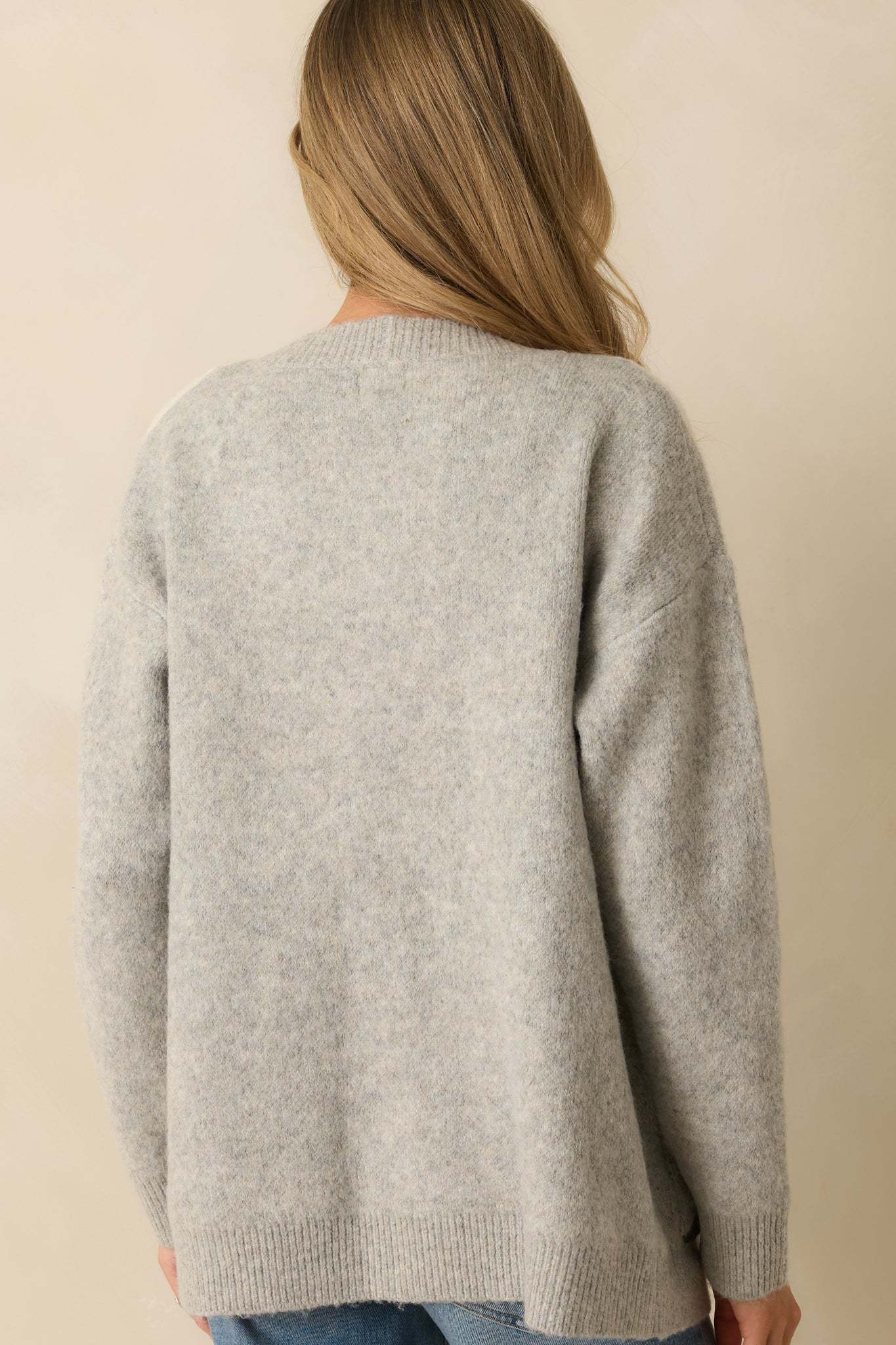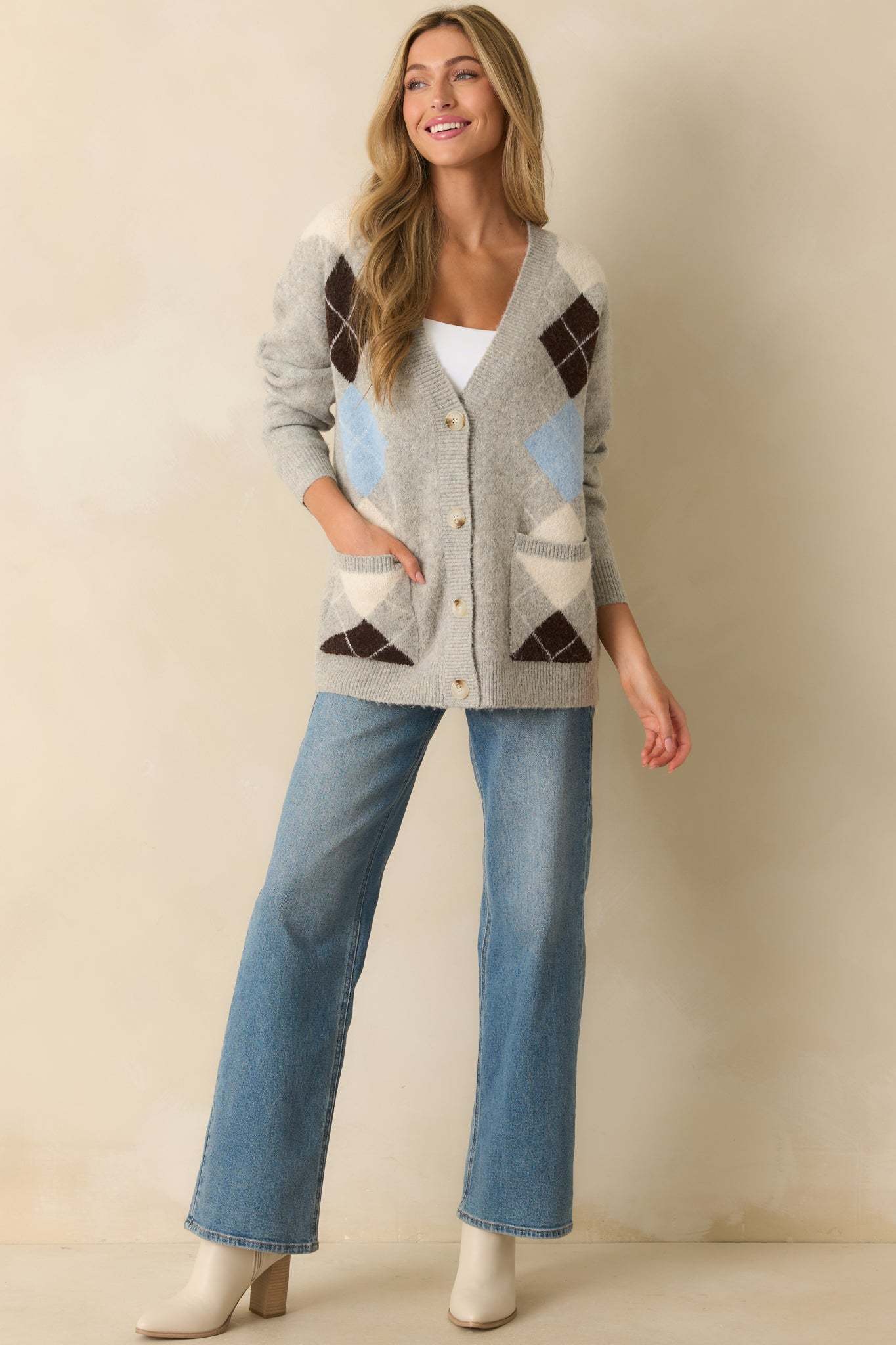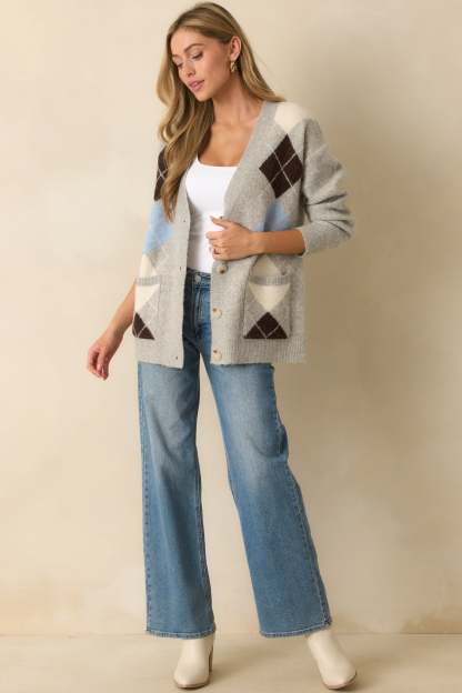 The Make Some Room Light Grey Multi Argyle Knit Oversized Cardigan makes space for easy layering, a relaxed yet put-together knit that works anywhere the day takes you. This light grey cardigan features a soft knit fabric with an ivory, brown, and blue argyle pattern at the front, a deep v-neckline, long sleeves, functional front patch pockets, functional button front closure, ribbed hems, and an oversized fit.