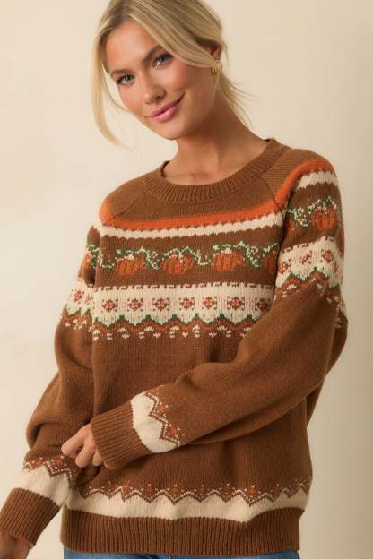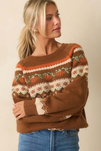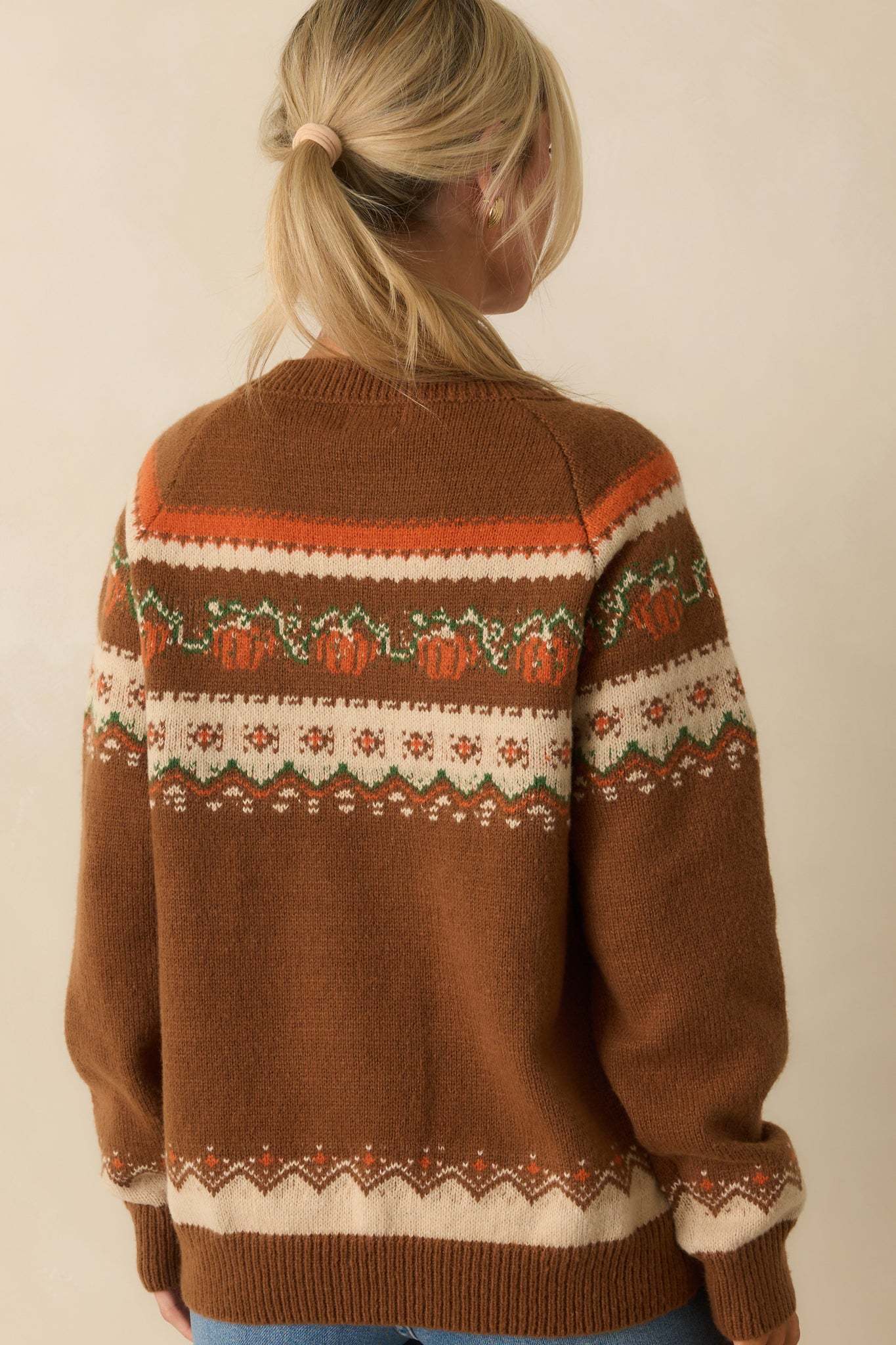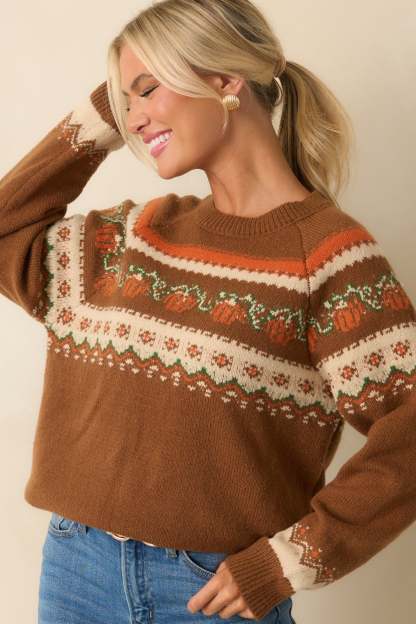 The More To The Story Brown Pumpkin Fair Isle Knit Sweater adds another layer to the season, a cozy style that feels warm, playful, and full of character. This brown knit sweater features an multicolor pumpkin and floral fair isle pattern, crew neckline, long sleeves, ribbed cuffs and hem, and a relaxed silhouette.