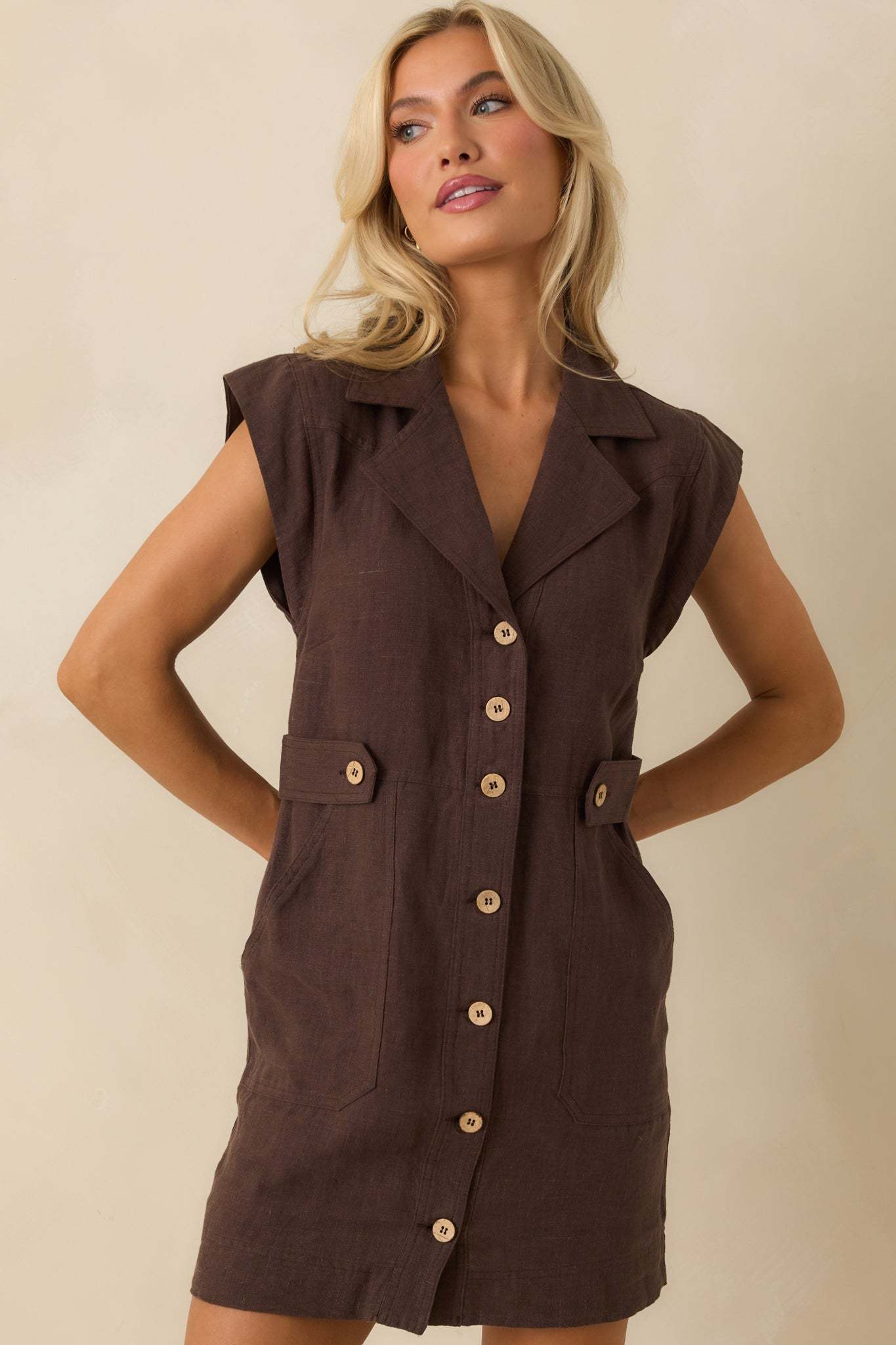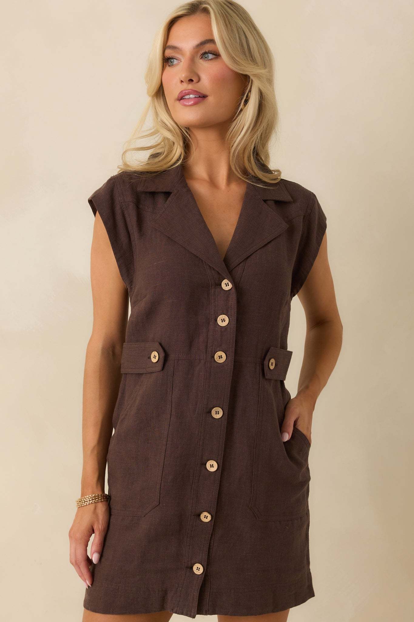 The Never A Bad Day Dark Brown Linen Button Front Mini Dress is the kind of piece that turns even ordinary days into something special. Crisp and breezy, it’s perfect for warm afternoons, casual get-togethers, or whenever you want your style to feel fresh, simple, and effortlessly chic. This brown mini dress features a lightweight 100% linen fabric, a notched lapel collar neckline, functional wooden button front, and functional front patch pockets.