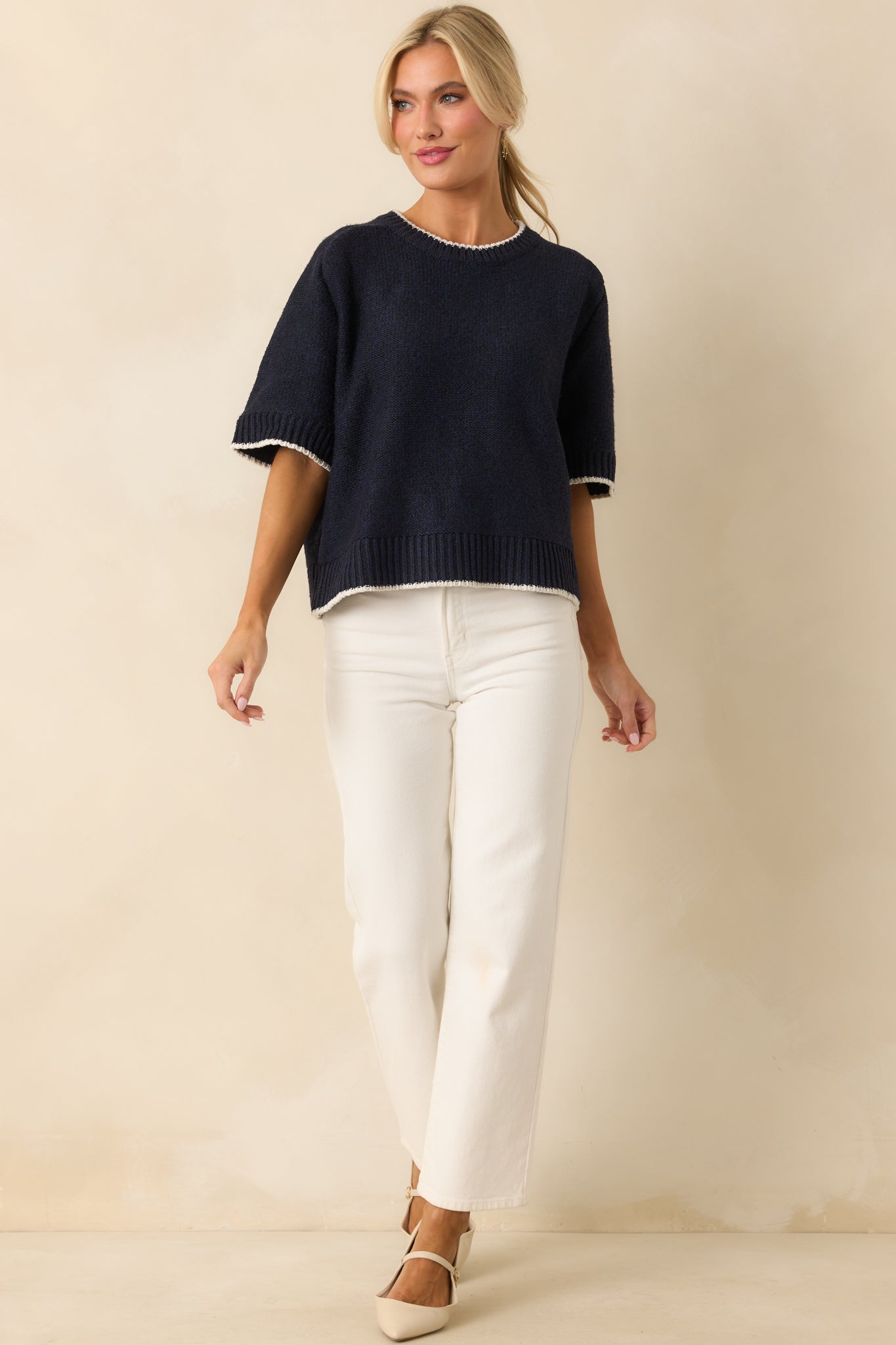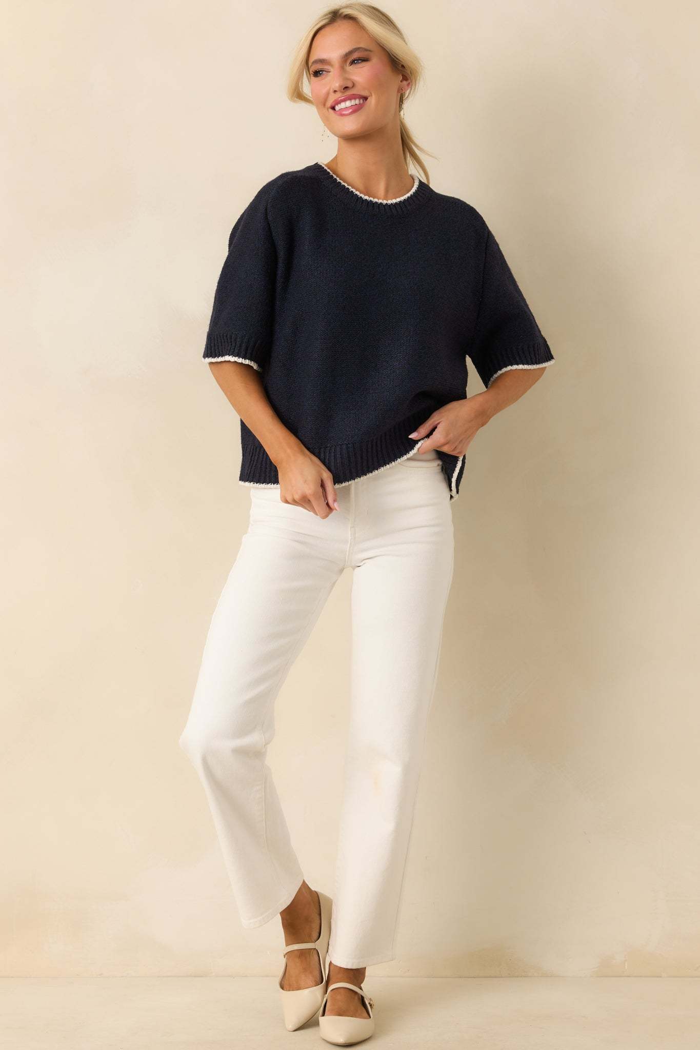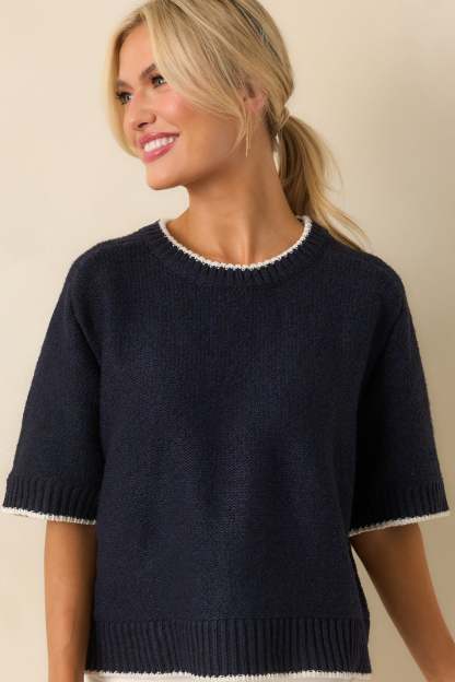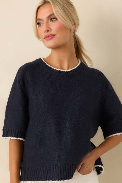 The Never Looked Back Navy Contrast Trim Short Sleeve Sweater is all about moving forward in style, giving you a fresh, confident look that feels just right for any day. This navy sweater features a crew neckline, an oversized fit, short sleeves, ivory contrast trim, ribbed hems, and a knit fabric.