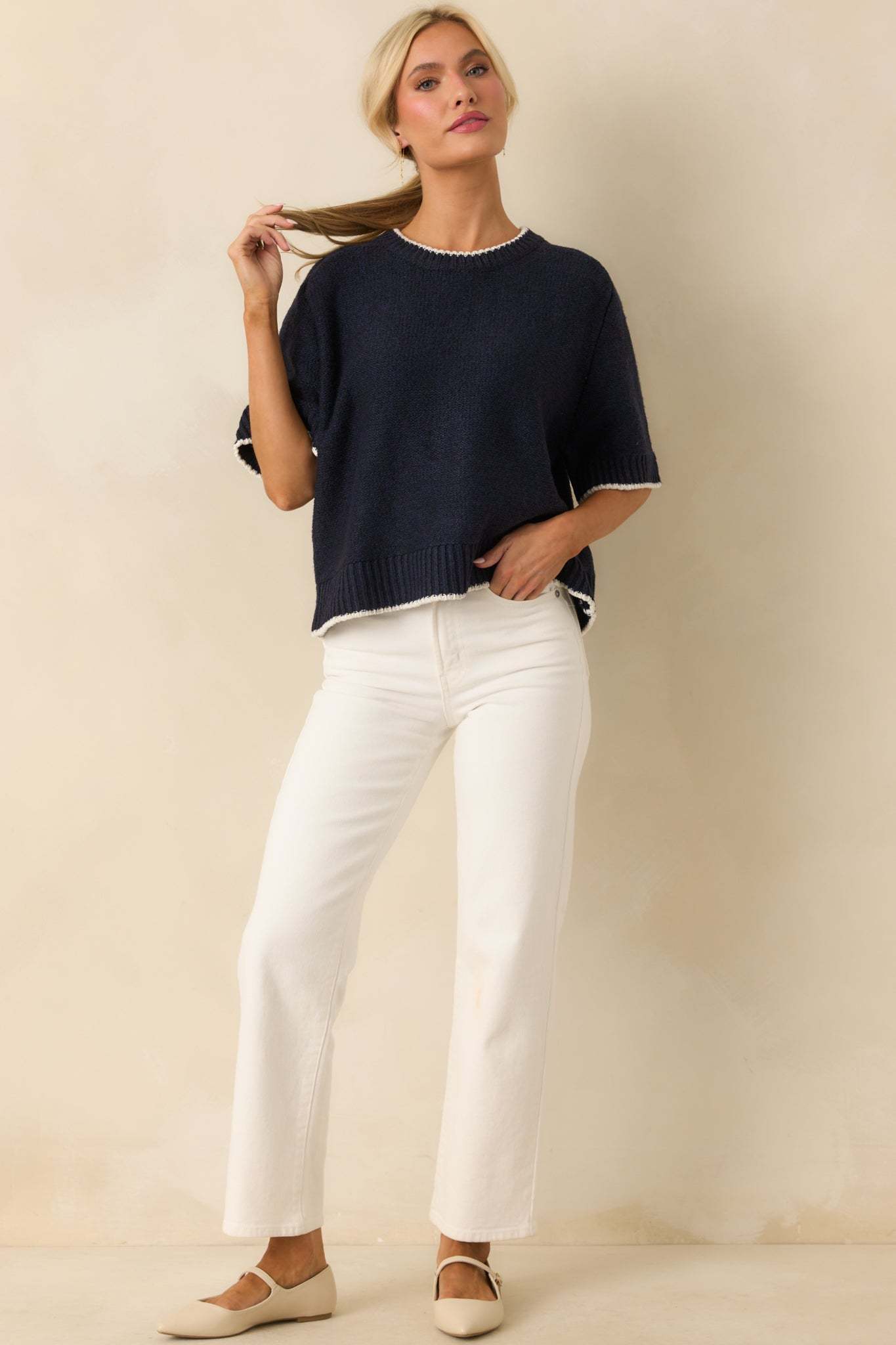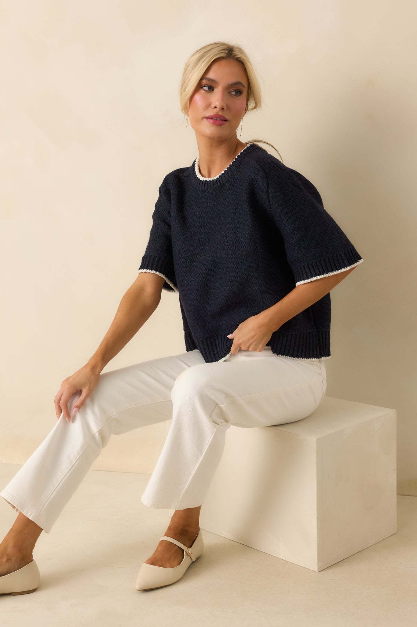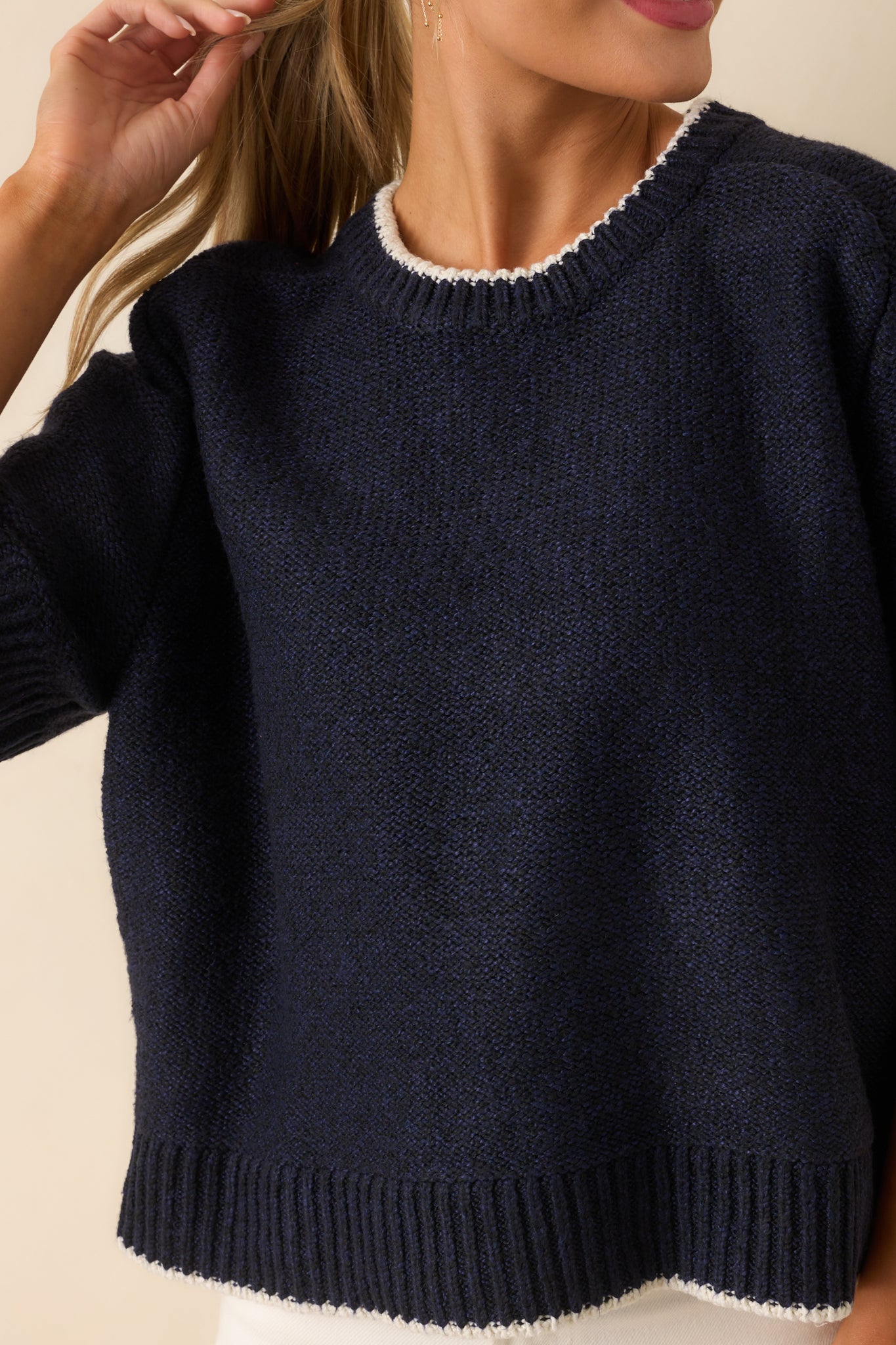 The Never Looked Back Navy Contrast Trim Short Sleeve Sweater is all about moving forward in style, giving you a fresh, confident look that feels just right for any day. This navy sweater features a crew neckline, an oversized fit, short sleeves, ivory contrast trim, ribbed hems, and a knit fabric.