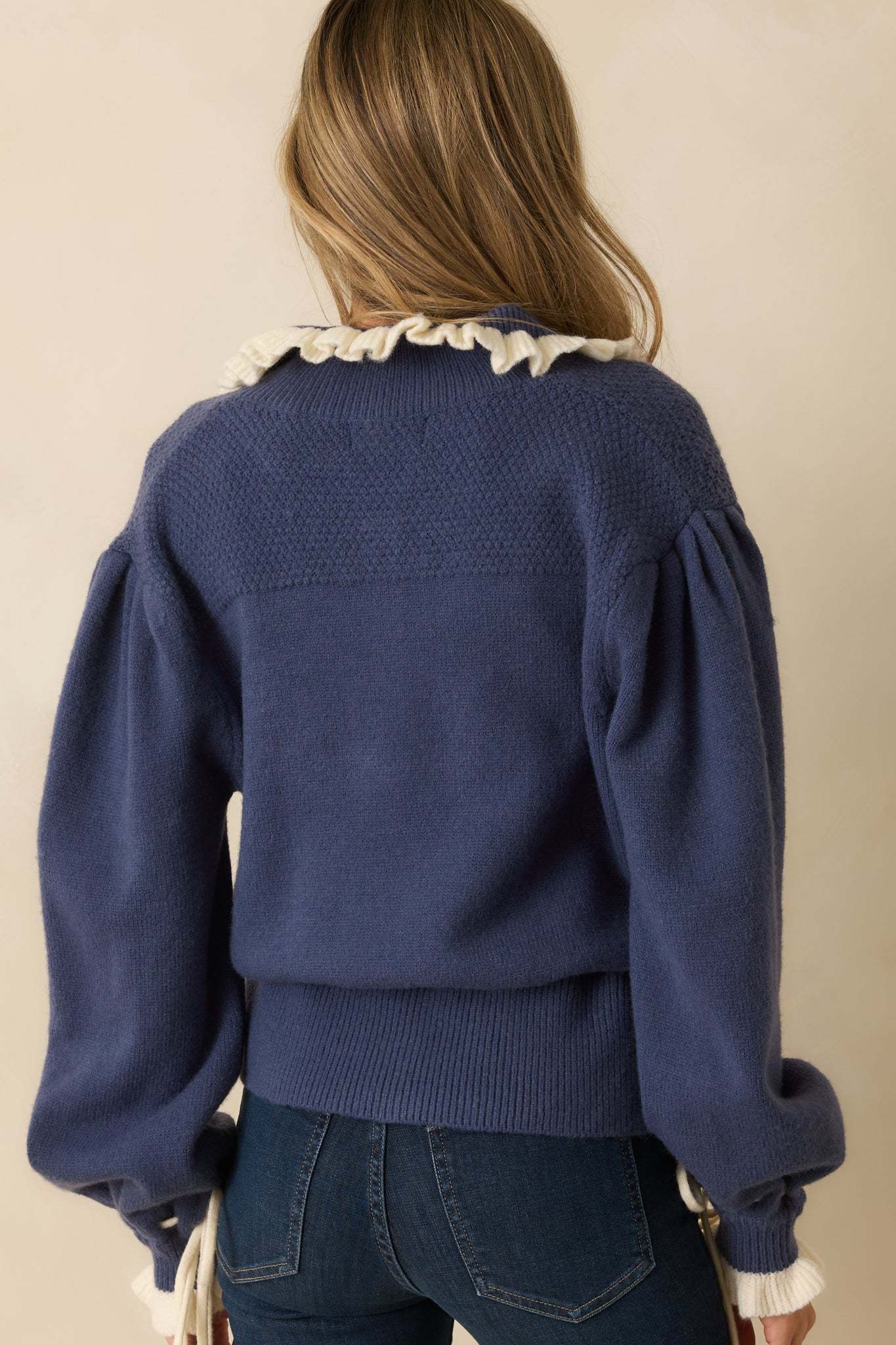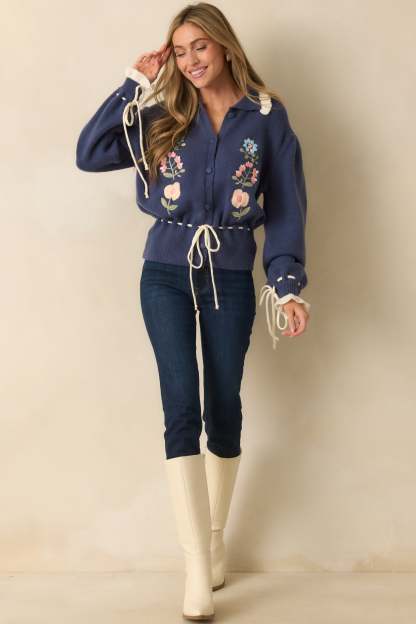 The Nothing Better Dusty Blue Floral Embroidered Drawstring Waist Cardigan is the cozy layer you’ll keep coming back to, effortless to wear and easy to love season after season. This dusty blue cardigan features multicolor floral embroidered front, a collared neckline with ivory ruffle trim, functional button front closure, long sleeves with tie ruffle trim cuffs, a drawstring tie waist, and a ribbed hem.