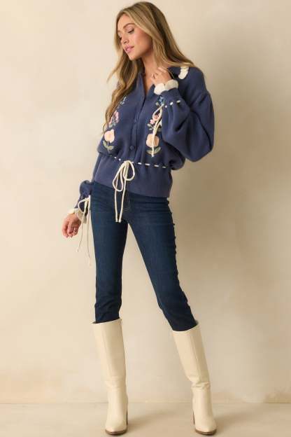Nothing Better Dusty Blue Floral Embroidered Drawstring Waist Cardigan
