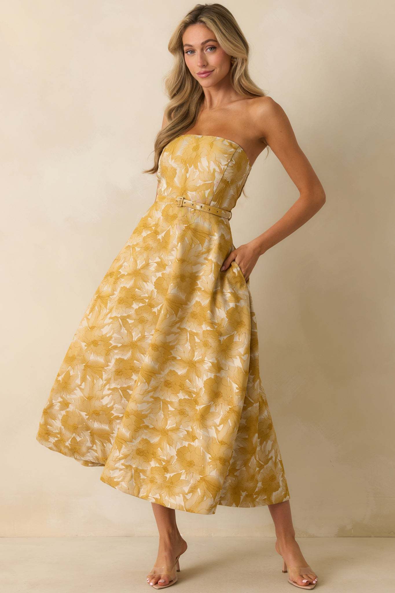 The Perfectly Placed Yellow Gold Floral Jacquard Strapless Midi Dress feels intentional in every way, a statement piece that comes together just right for any special moment. This yellow gold midi dress features a strapless neckline, silicone non-slip strip, fitted bodice, optional waist belt, functional side pockets, and a hidden back zipper closure.