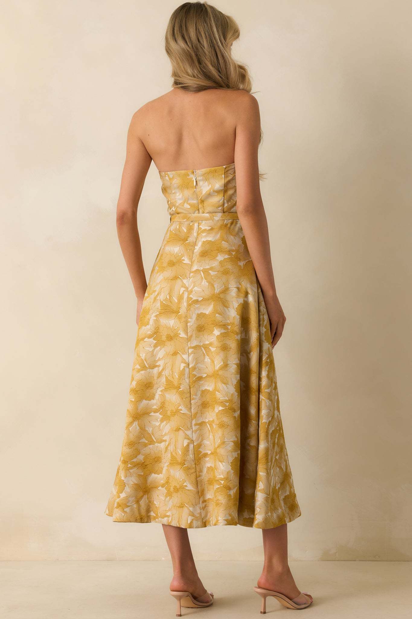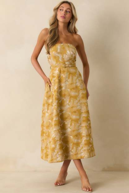 Perfectly Placed Yellow Gold Floral Jacquard Strapless Midi Dress