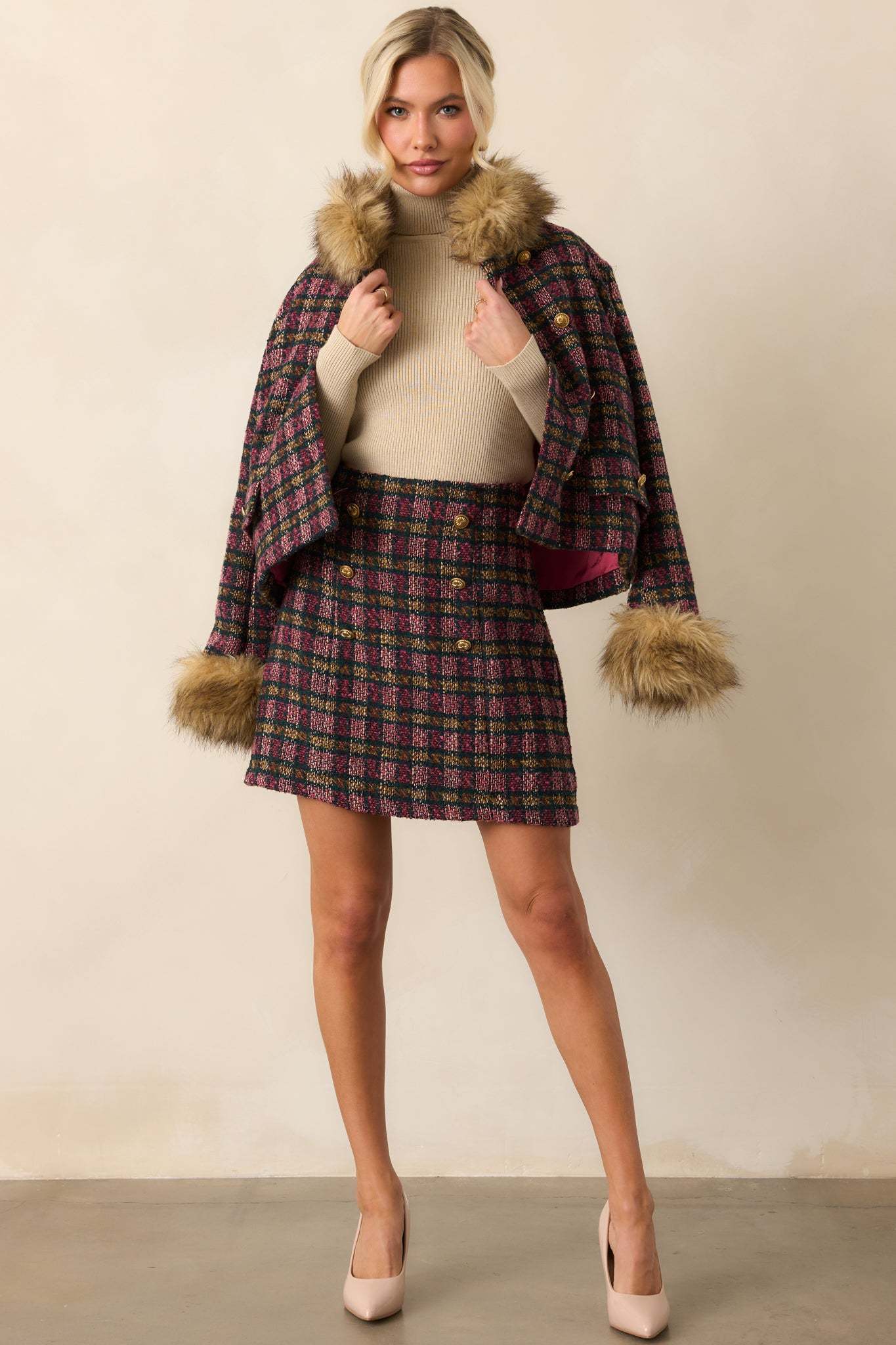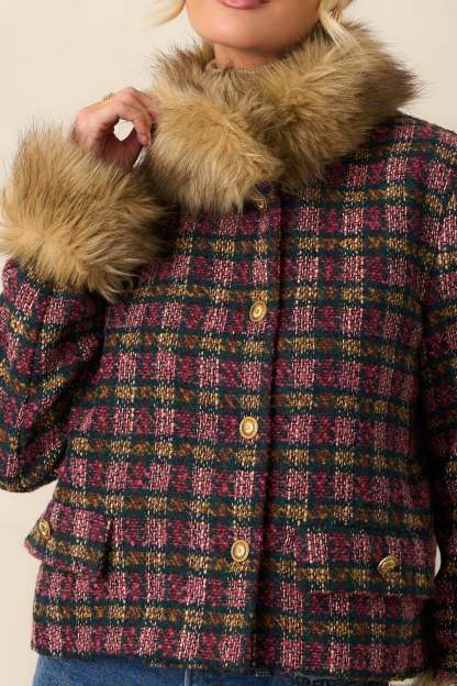 The Prosperina Bouvier Pink Multi Plaid Tweed Jacket nods to timeless refinement, a polished tweed layer with an unmistakably classic, chic appeal. This tweed jacket features pink and green multicolor plaid tweed fabric, a boxy silhouette, functional button front closures, functional flap pockets at the waist, and faux fur collar and cuffs.