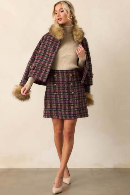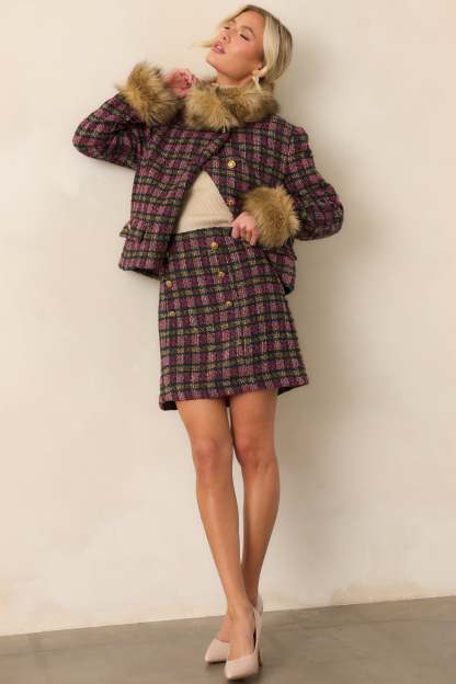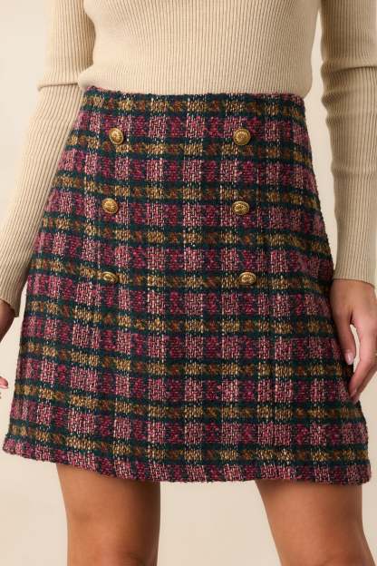 The Prosperina Gardner Pink Multi Plaid Tweed Mini Skirt captures refined charm, a tailored tweed piece with a polished, feminine finish. This pink multi-color plaid mini skirt features a tweed fabric, double-breasted front with six gold crest-style buttons, a high-rise waist, a concealed back zipper, and full satin lining.