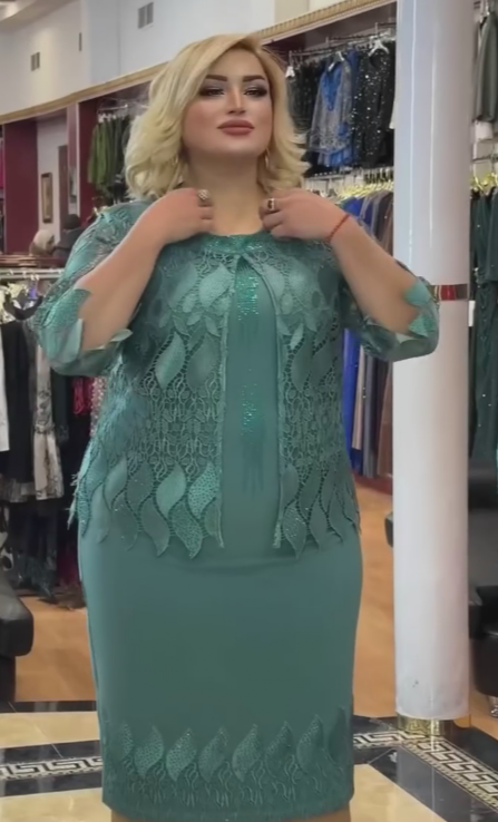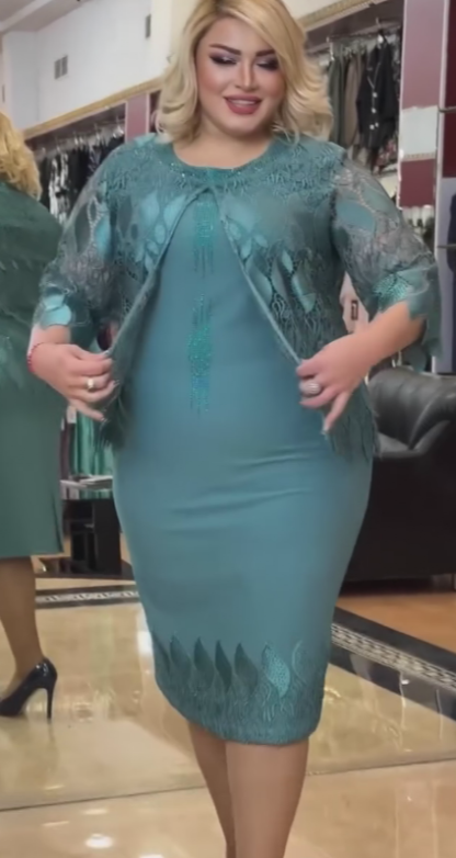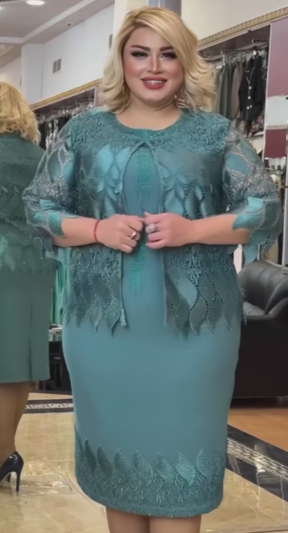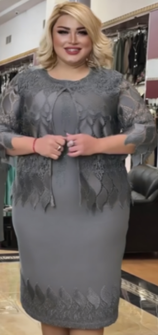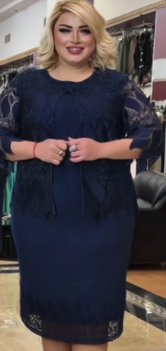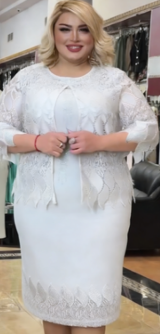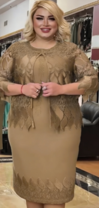 Sukienka z koronkowymi zdobieniami w kształcie liści, okrągłym dekoltem i rękawami o średniej długości