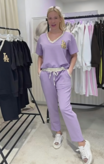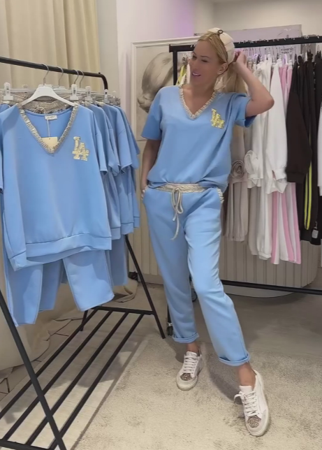 Przyciągające wzrok logo „LA” z kryształkami zdobi lewą część klatki piersiowej, wyróżniając się na jasnoniebieskim tle.