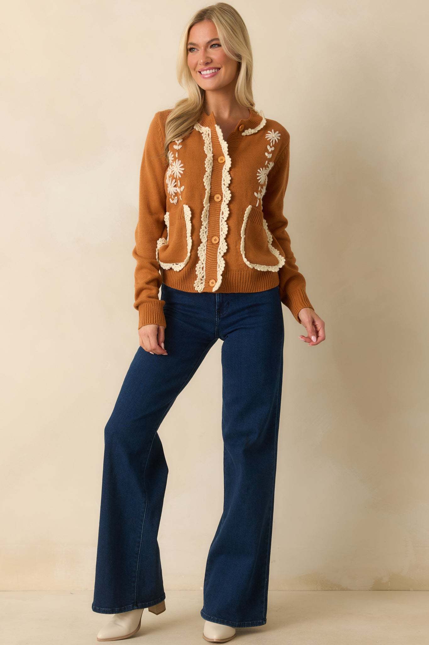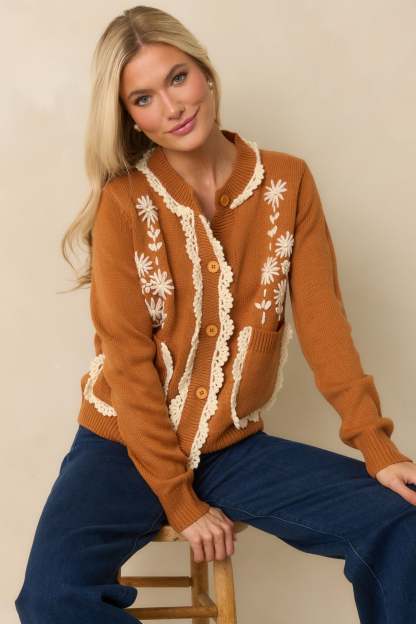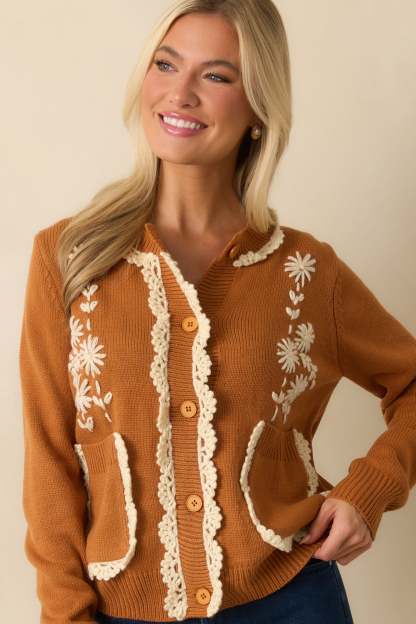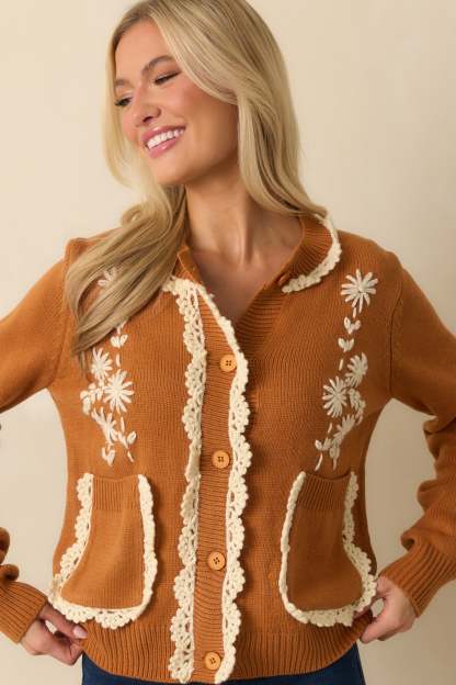 The Settling In Caramel Brown Floral Embroidered Button Front Cardigan feels warm and inviting, a charming layer made for easy moments and everyday comfort. This caramel brown cardigan sweater features an ivory daisy embroidered front, scalloped crochet trim along the neckline, placket, and functional patch pockets, a round neckline, functional button front closure, long sleeves, and ribbed hems.