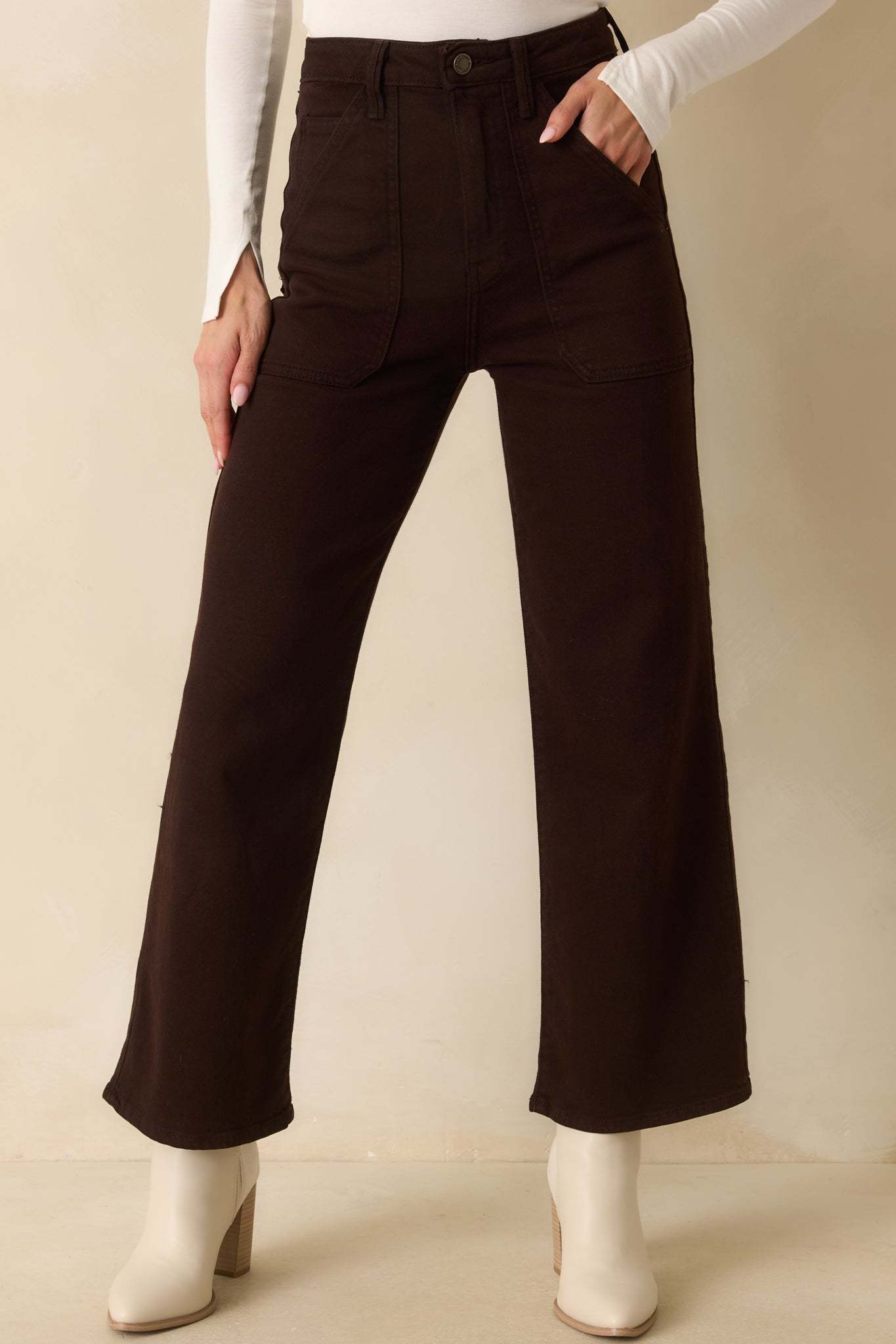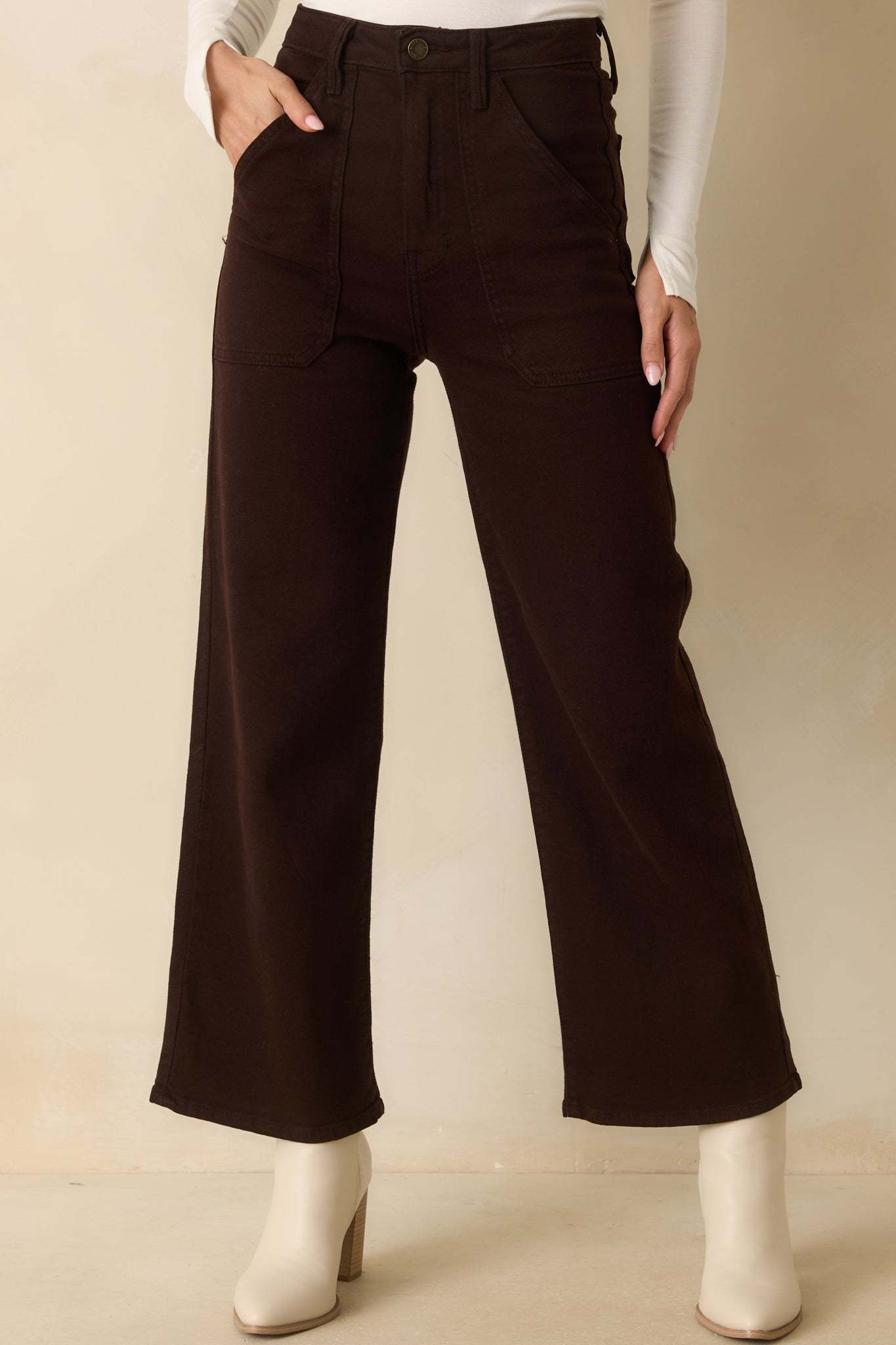 The Something Amazing Dark Brown Wide Leg Jeans are designed for those who appreciate standout style with everyday comfort. Their versatile medium wash and contemporary wide-leg cut make them a go-to choice for various occasions, effortlessly pairing with both casual and elevated pieces. These dark brown jeans feature functional front patch pockets, functional back pockets, functional belt loops, button zipper closure, a high rise design, and a wide leg silhouette.