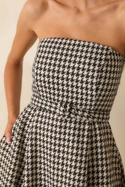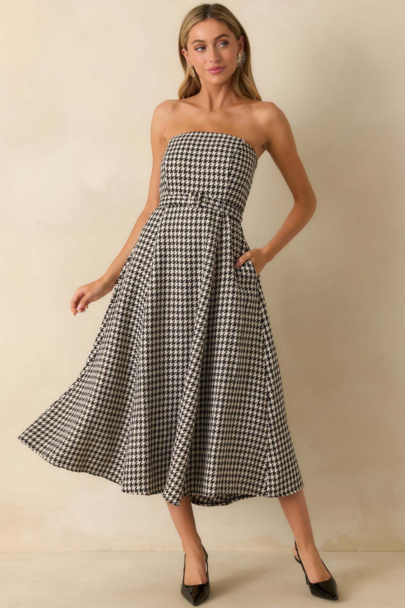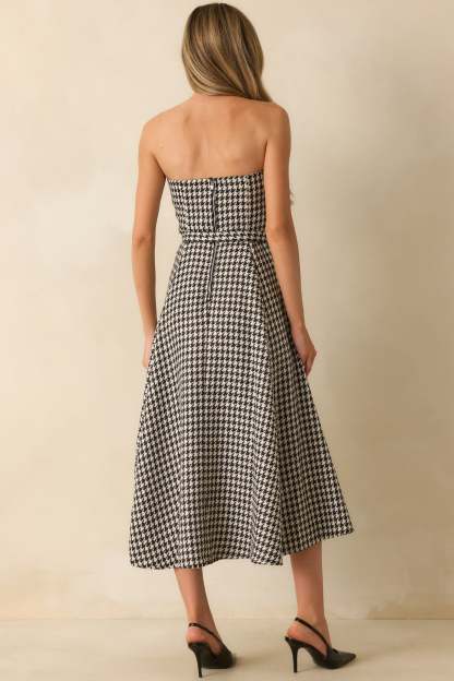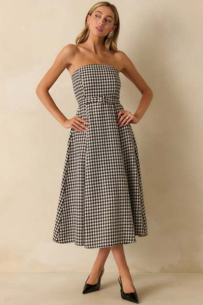 The Something To Remember Black Houndstooth Belted Bandeau Midi Dress is the kind that never goes unnoticed - classic yet striking in black houndstooth, with a sleek strapless neckline and cinched waist that flatter every curve. Its full A-line skirt moves with quiet confidence, making it just as unforgettable as the moment you wear it. This black houndstooth bandeau midi dress features a strapless neckline, belted waist, and A-line silhouette, designed with a concealed back zipper, full lining, and structured woven fabric for a polished, tailored finish.