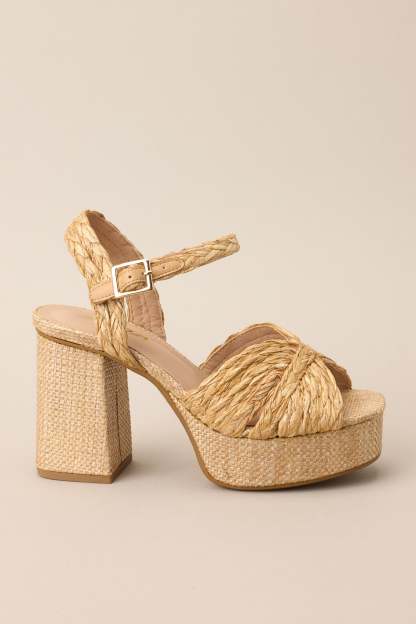 Elevate your style with Sunset Steps Natural Espadrille High Heel Platform Sandals! These sandals will take you from day to night, and to new fashion heights! With their natural color and unique design, they are perfect for any occasion. Get ready to step into a fashionable sunset! These sandals feature a wide strap over the top of the foot, a strap around the ankle with a classic buckle closure, a platform, and a chunky heel.