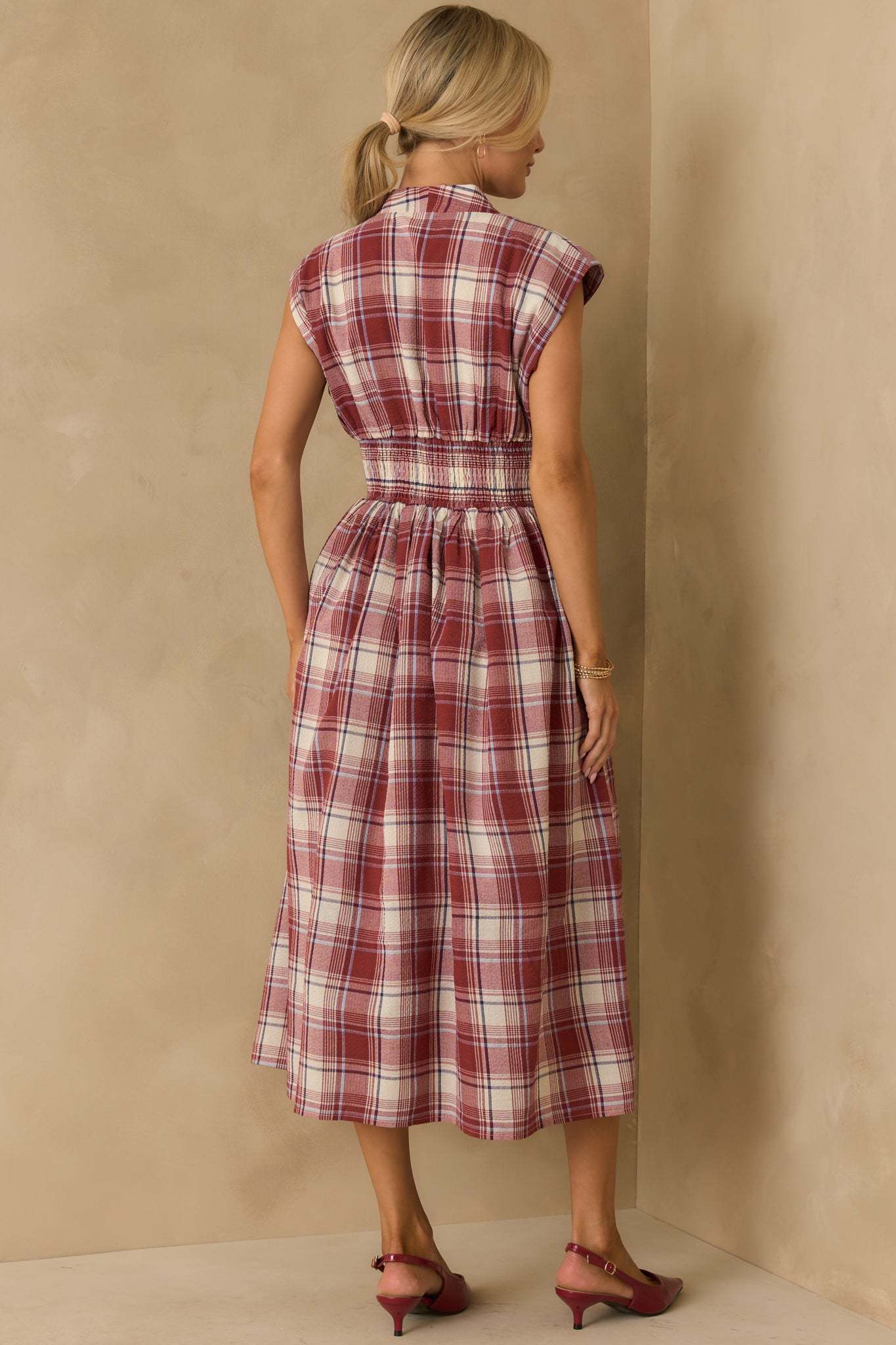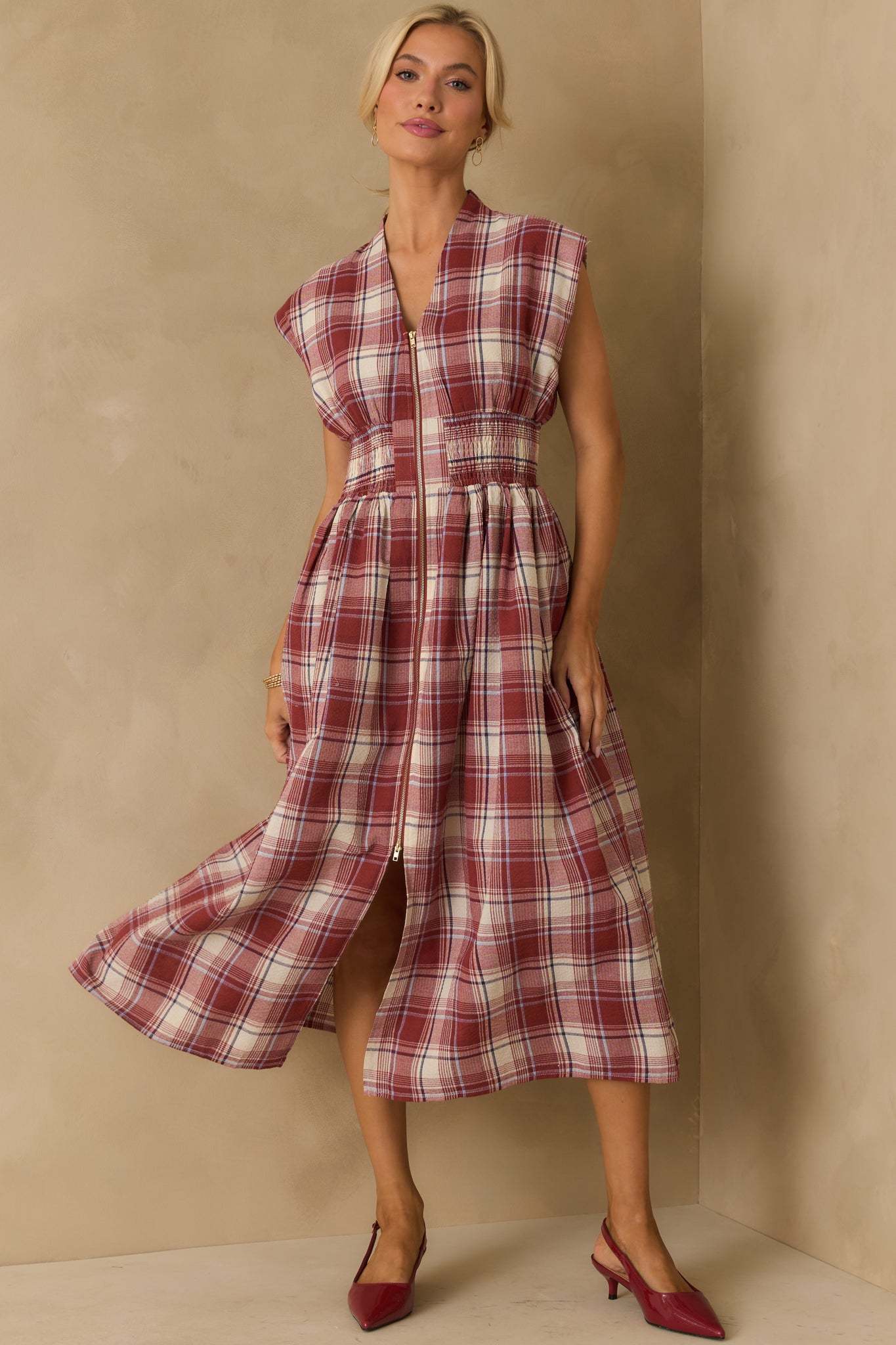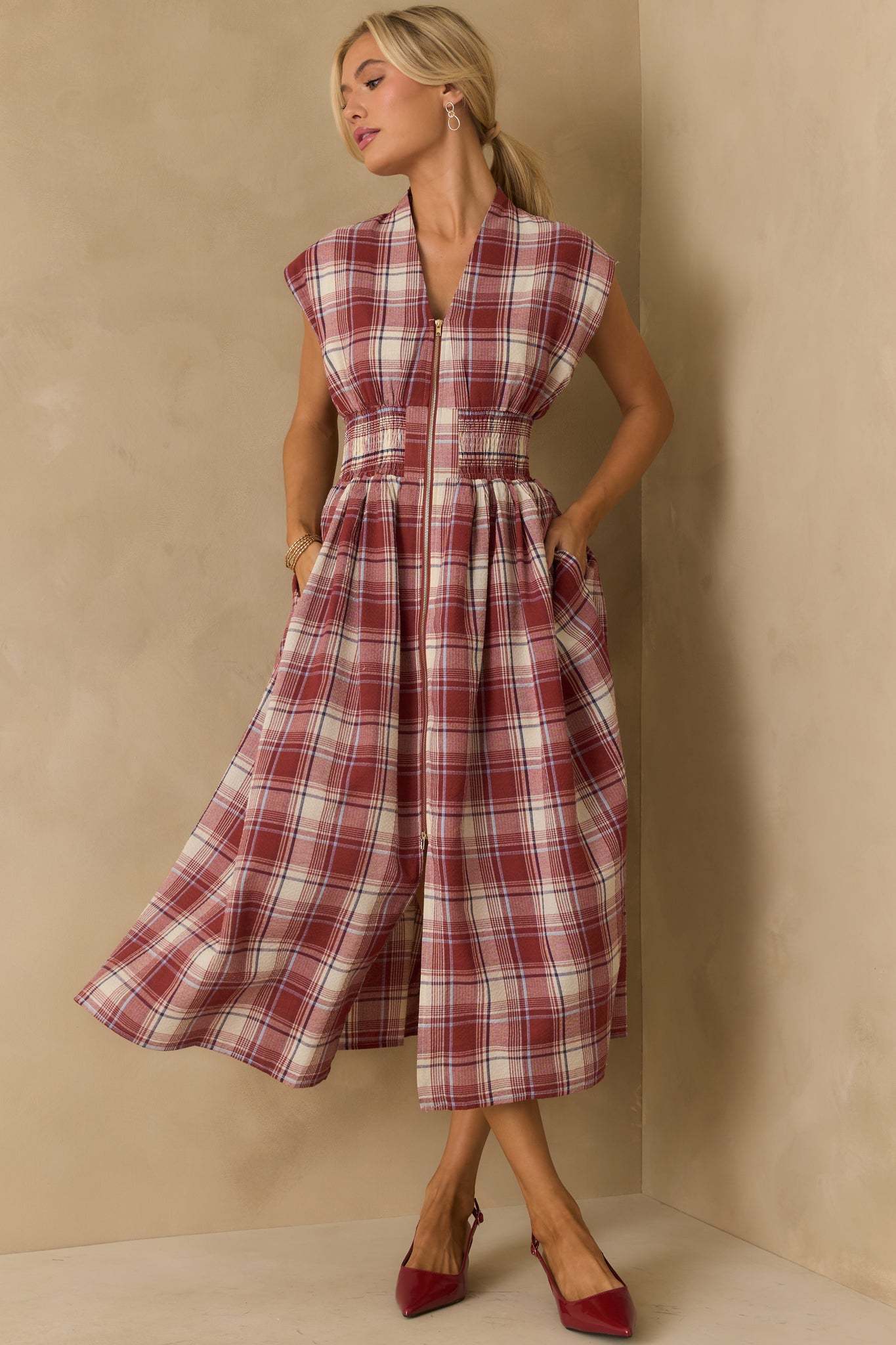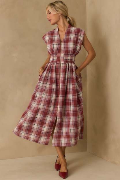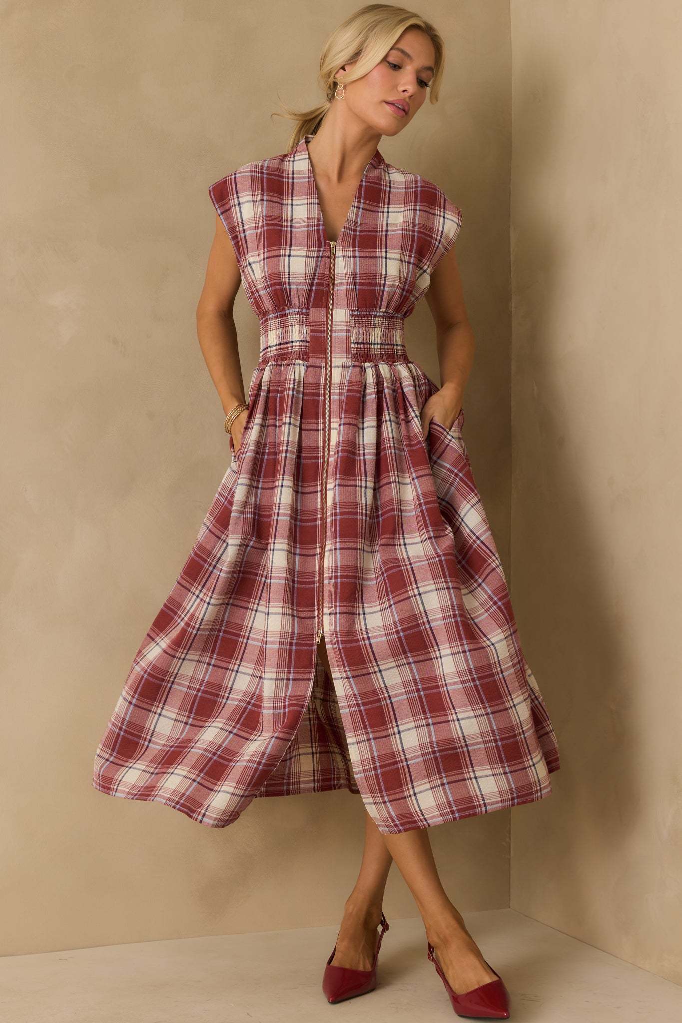 Get ready to turn heads in The Evette Red Tartan Plaid Cotton Zip Front Midi Dress! This flattering silhouette has become a Red Dress evergreen style due to it's versatility and comfort. Whether you're heading to after-work cocktails or running errands around town, this dress is your perfect day to night outfit. This red midi dress features a tartan plaid print, v-neckline, padded shoulders, capped sleeves, a full zipper front, a fully smocked waist, functional hip pockets, and a front slit.