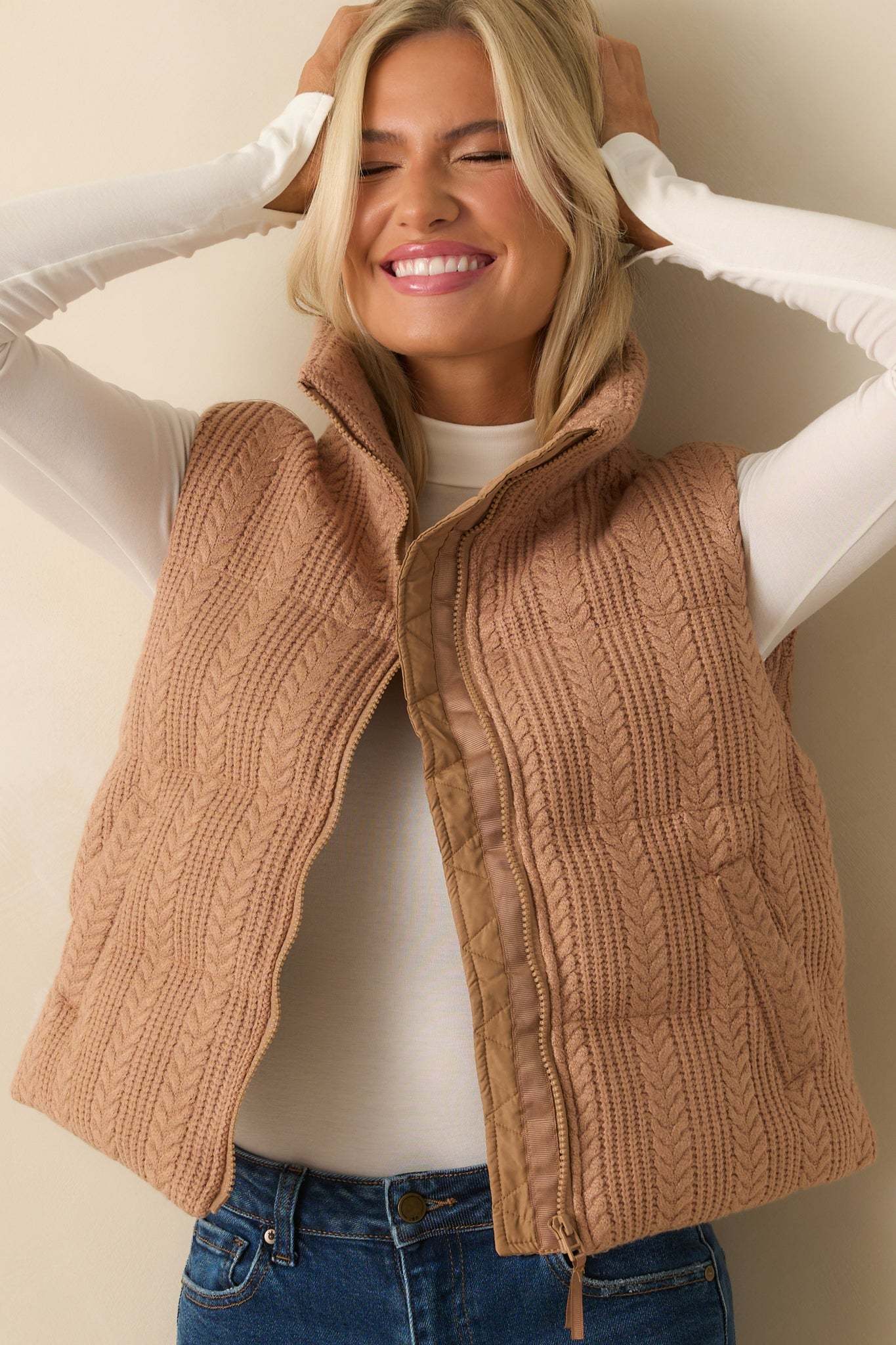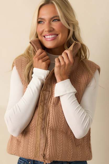 The It Comes Down To This Camel Brown Cable Knit Puffer Vest is the piece that makes it all come together, easy and effortless every time, always giving your look the perfect finishing touch. This camel brown puffer vest features a quilted cable knit exterior, high stand collar, sleeveless, a lightly padded body with a smooth interior lining, functional full zip front, and functional pockets.