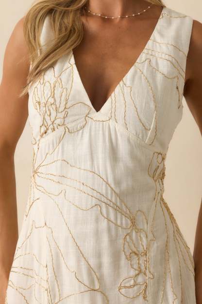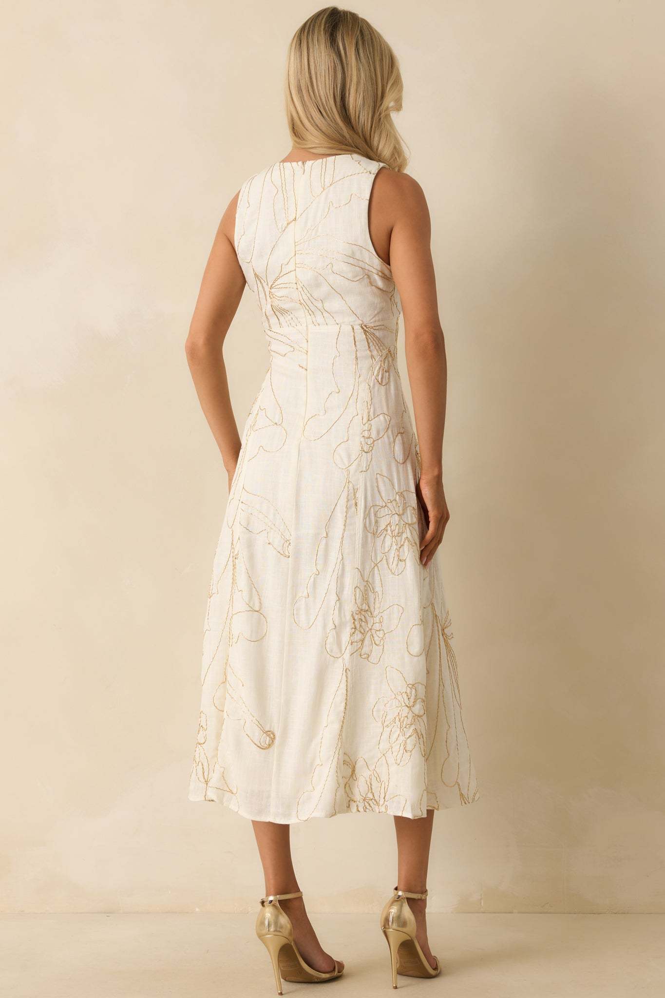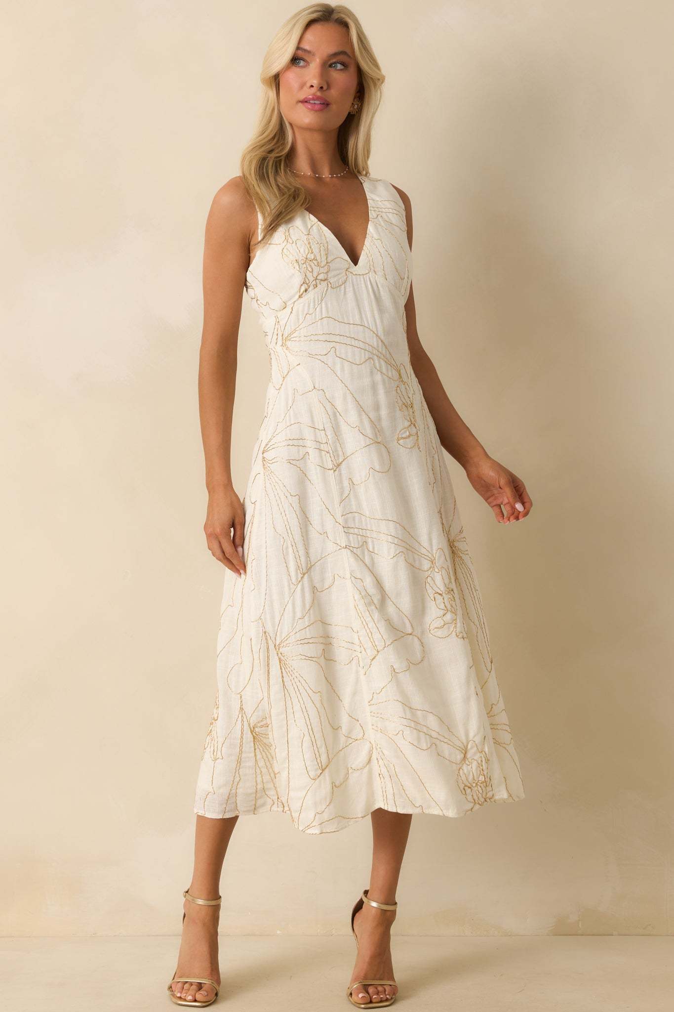 The To Be Clear Ivory Gold Bead Embroidered Floral Print Midi Dress leaves no doubt, a standout piece that defines your look with unmistakable elegance. This ivory midi dress features a golden beaded floral embroidery throughout, a deep v-neckline, fitted bodice, flowy skirt, and a concealed back zipper closure.