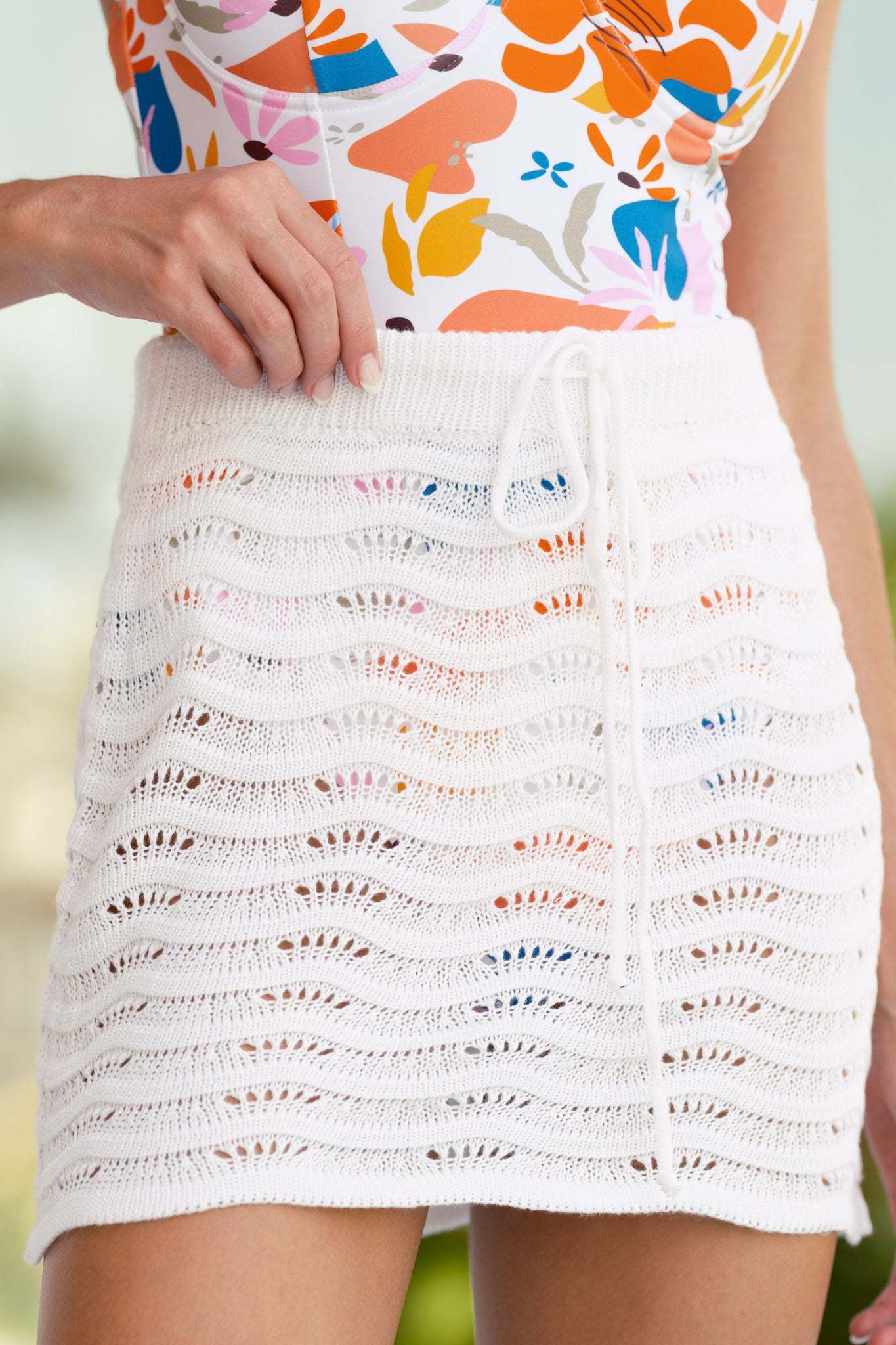 The Under The Golden Sun White Open Knit Cover Up Mini Skirt is perfect for slipping on over your swimsuit for pool days, beach walks, or lounging in the sun. Light and breezy, it adds a stylish touch while keeping things relaxed and carefree. This white cover up features a mini skirt silhouette, wavy open knit fabric, a high rise elastic waist, and adjustable drawstring waist.