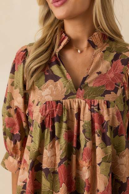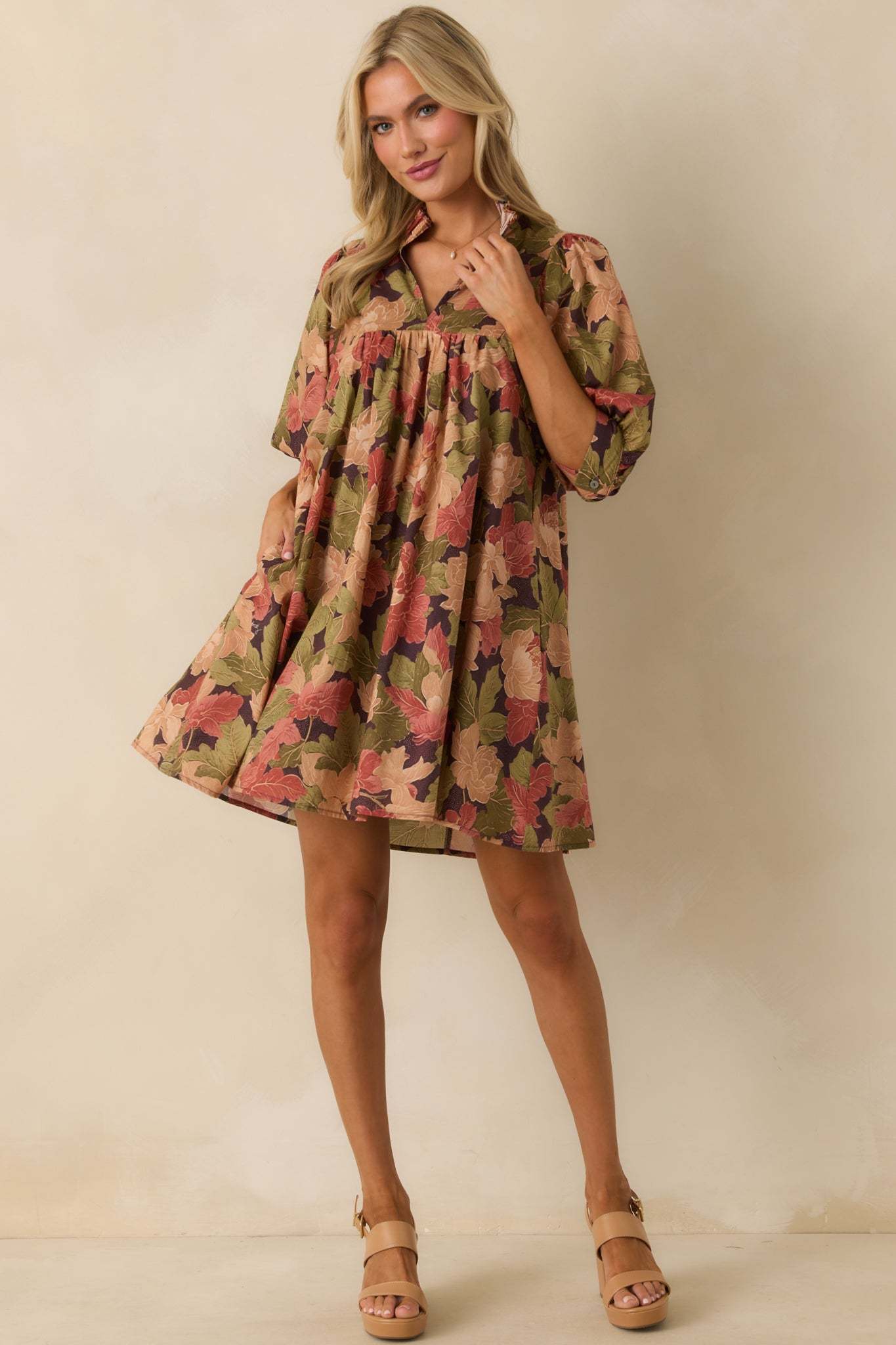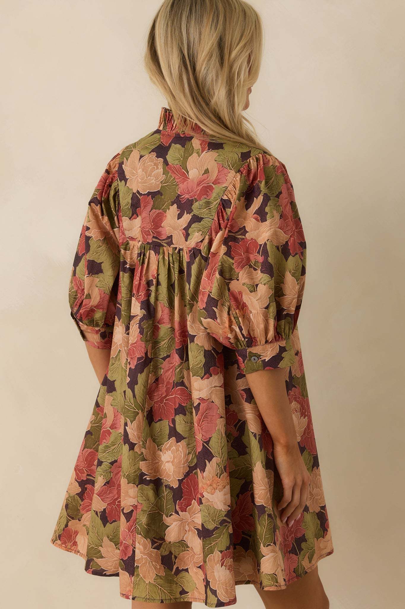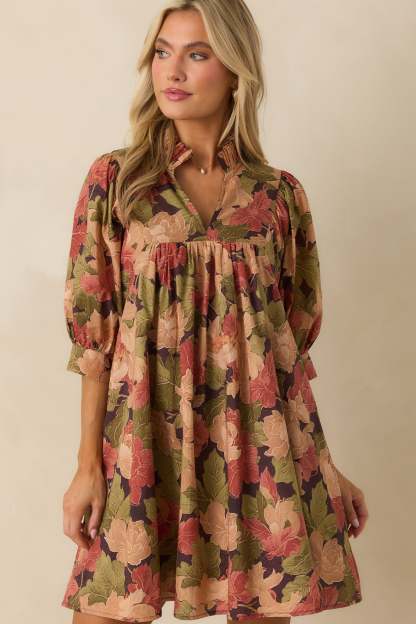 The Under The Willow Brown Multi Floral Print Cotton Mini Dress has a gentle charm, made for moments that feel serene, sweet, and a little bit wistful. This dress features a brown multicolor floral print, a split v-neckline with ruffle trim, a partial button front placket, half-length puff sleeves with button cuffs, and functional side seam pockets.