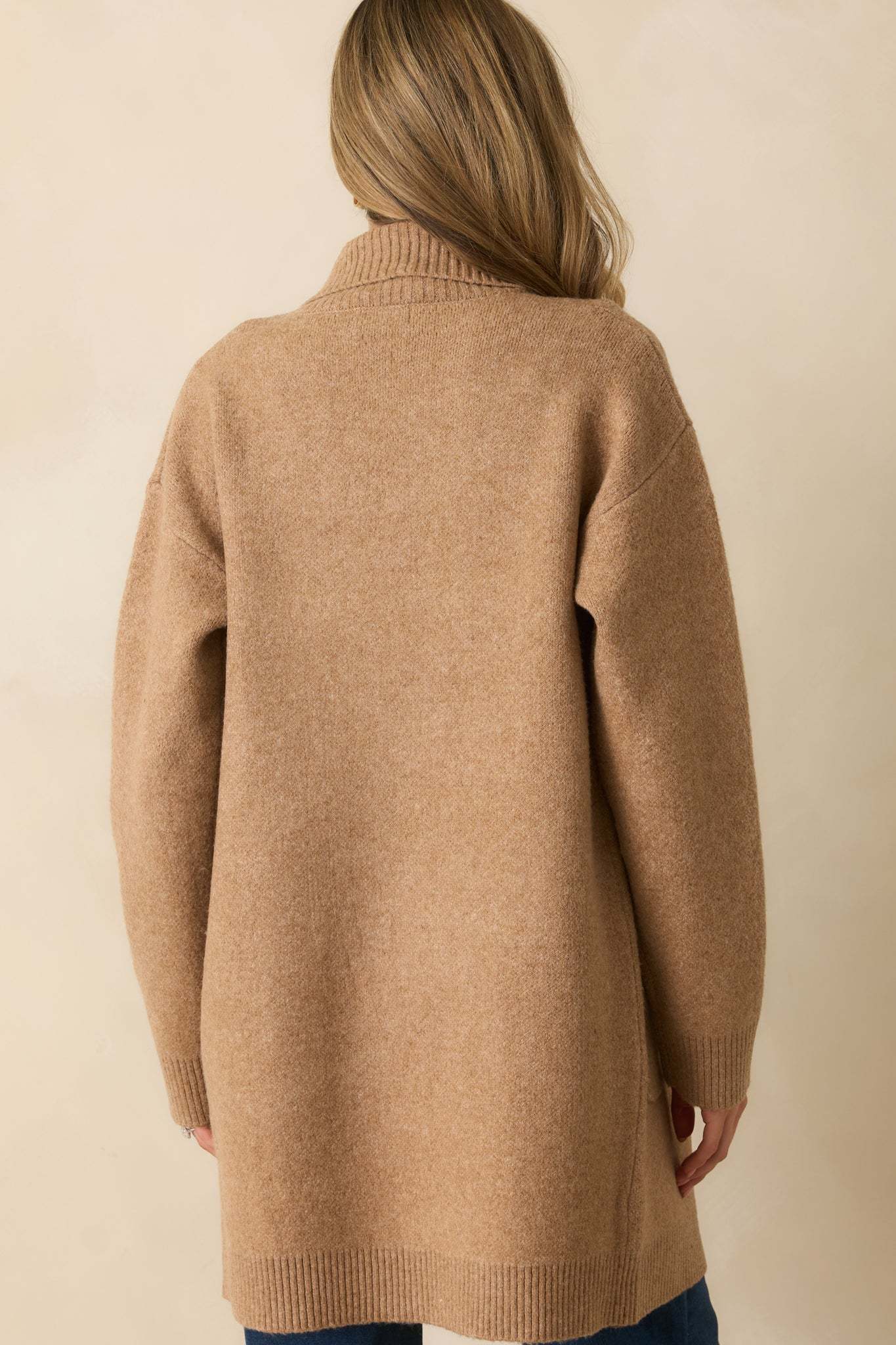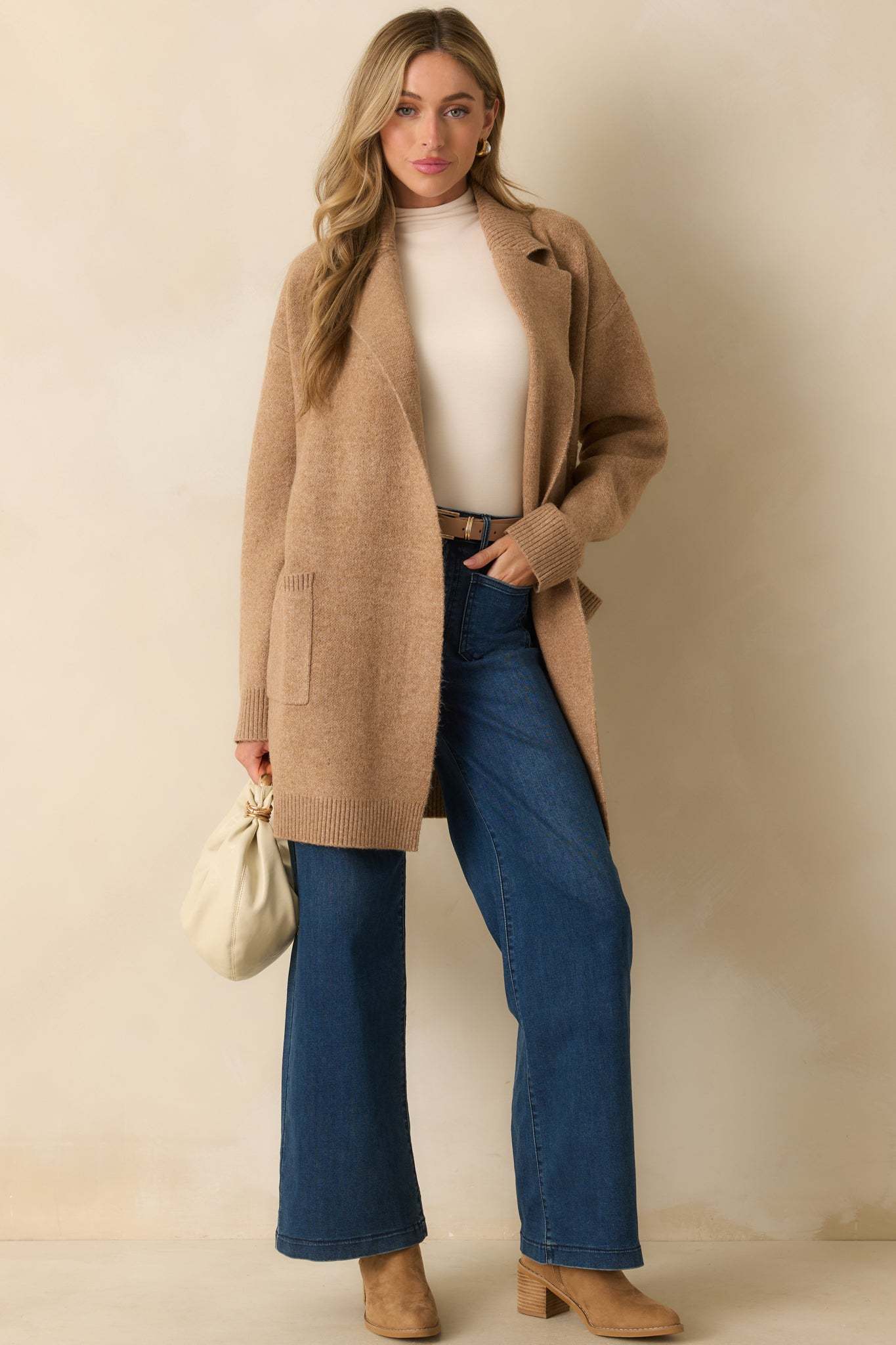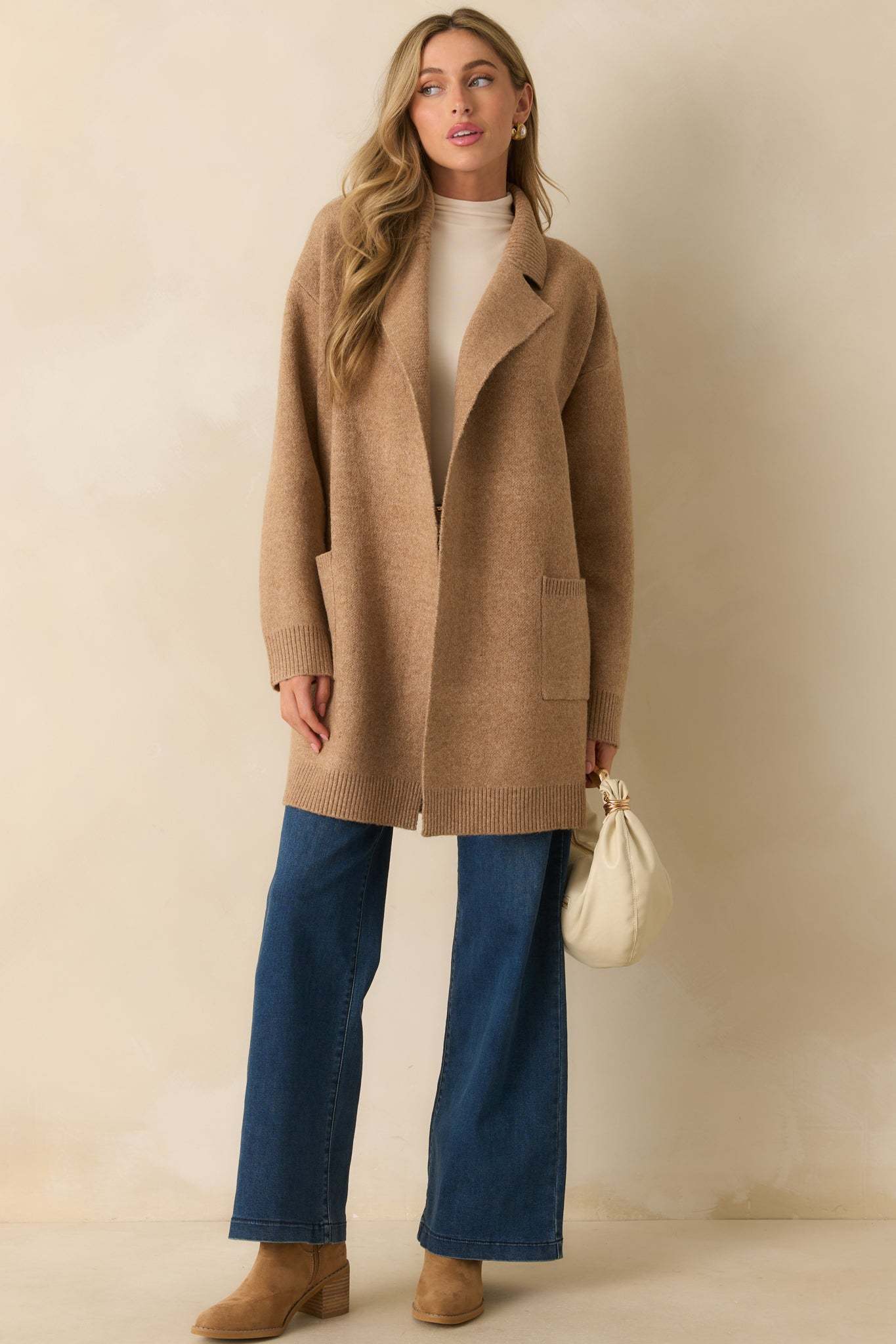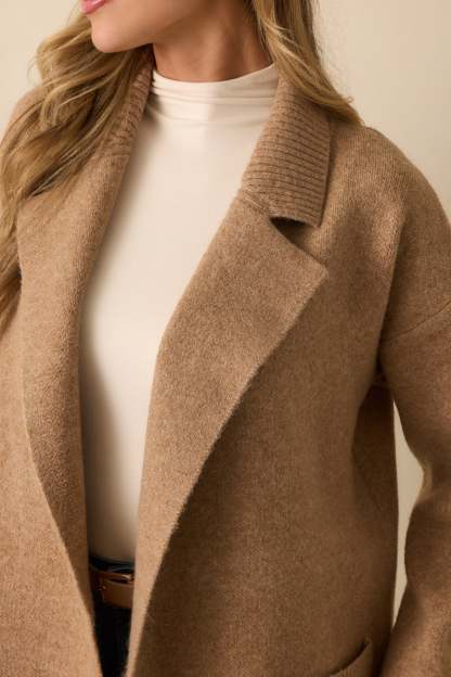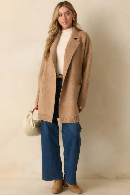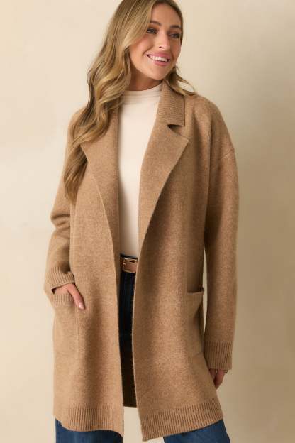 The What’s Left To Say Camel Brown Open Front Knit Cardigan speaks for itself, an easy layer that adds effortless warmth and finish to your look. This camel brown knit cardigan features a notched lapel collar, open front design, drop shoulders, long sleeves with ribbed cuffs, functional front patch pockets, and a ribbed hem.