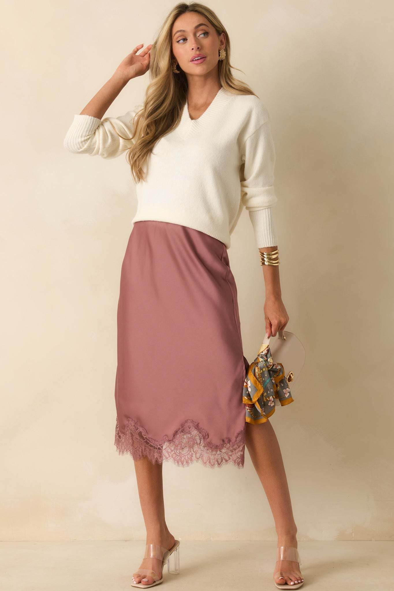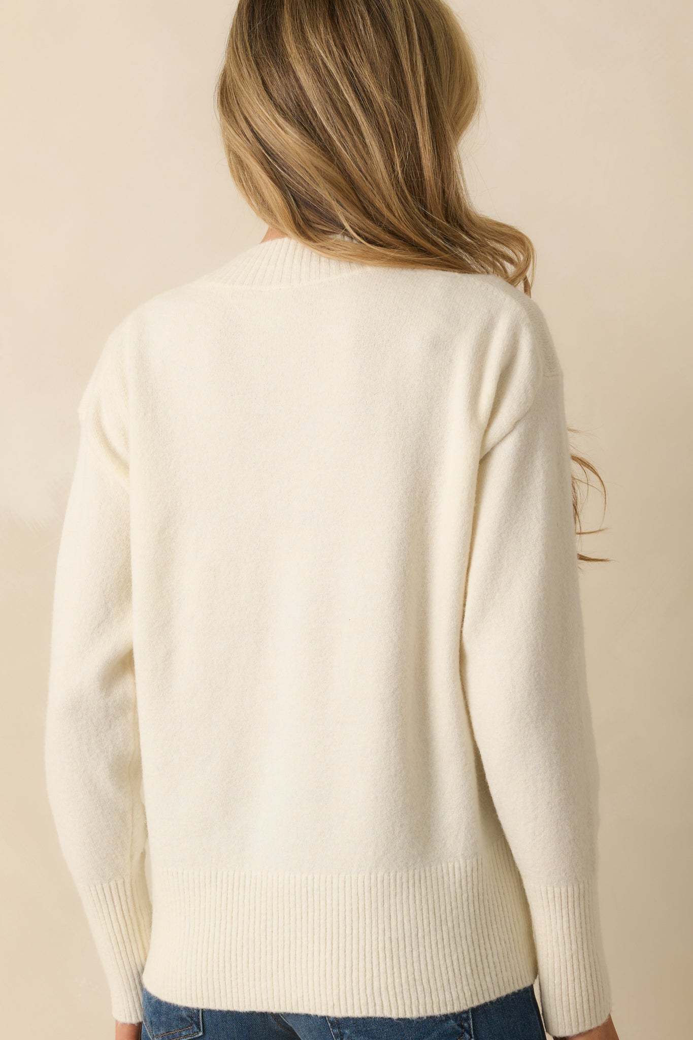 The What’s Your Story Ivory Knit Long Sleeve V-Neck Sweater invites endless styling possibilities, a soft, easy layer made to fit whatever chapter you’re in. This ivory soft knit sweater features a classic v-neckline with wide ribbed trim, long sleeves with ribbed cuffs, and a relaxed fit with a ribbed hem for a polished yet cozy look.